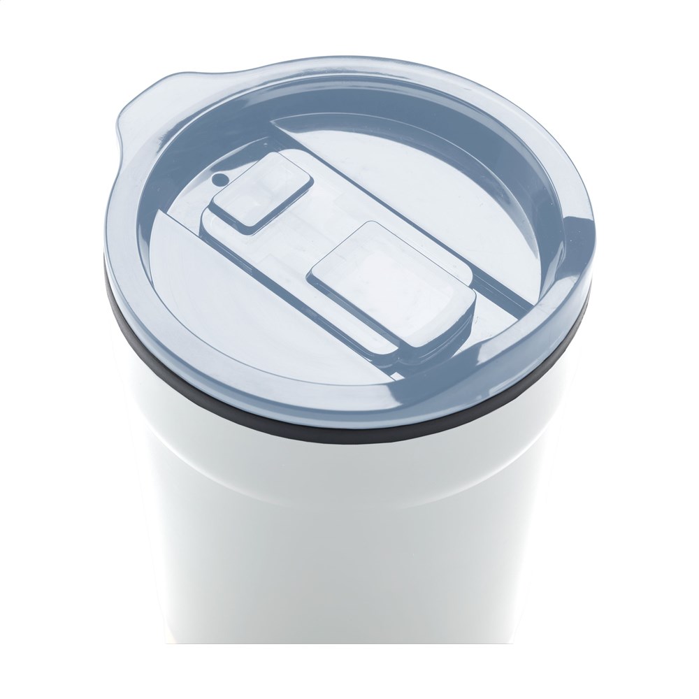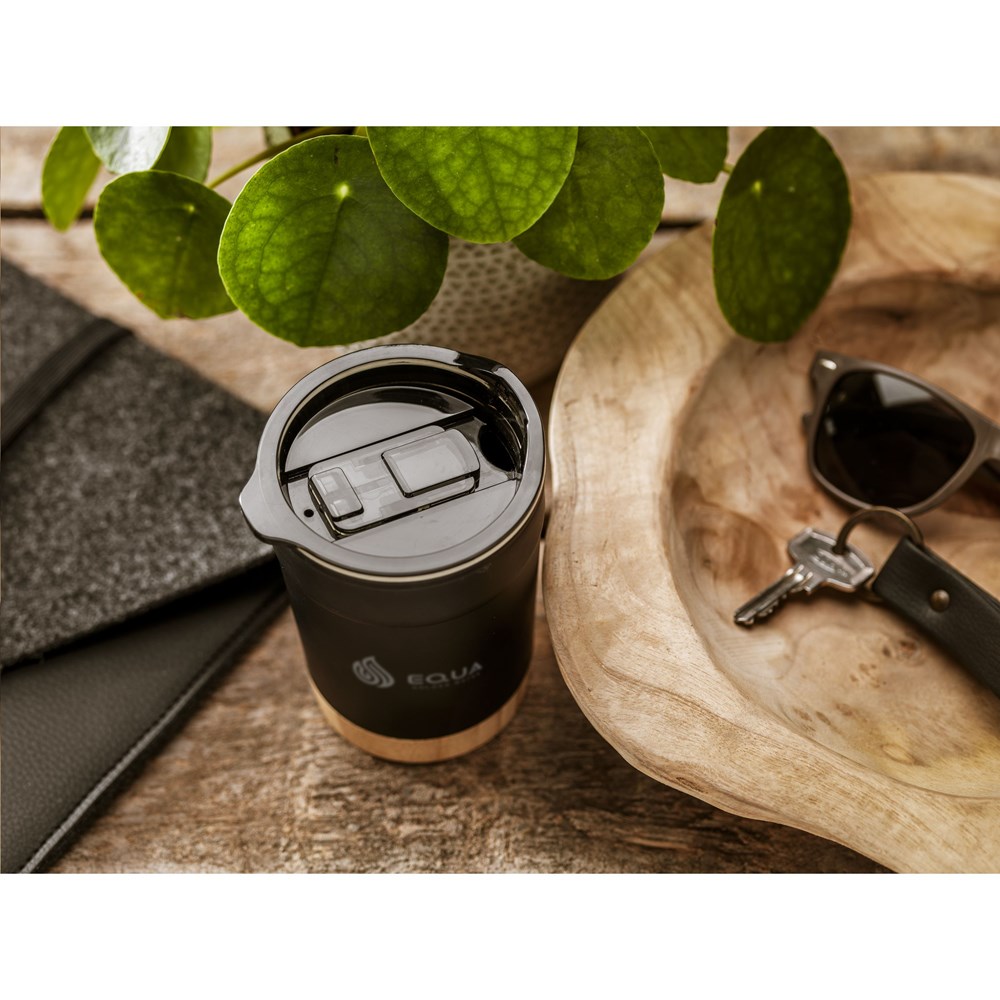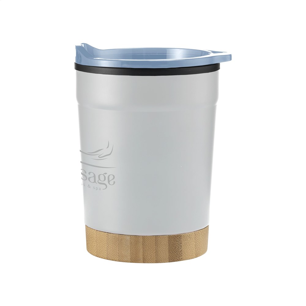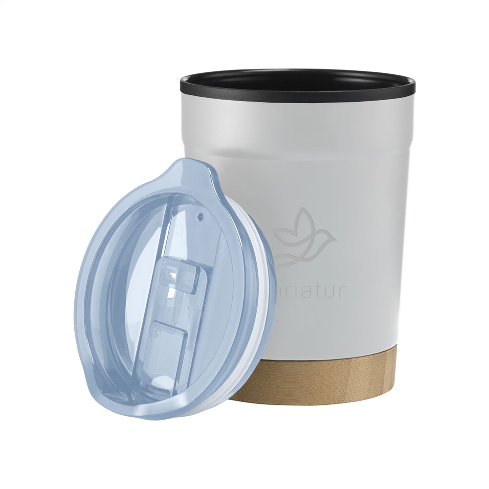 Dubbelwandige thermosbeker met RVS buitenwand en PP binnenwand. De beker heeft een zwart transparante push-on deksel met afsluitbare drinkopening. Een opvallend mooi detail is de bamboe onderzijde met een dikte van 1,5 cm. Inhoud 350 ml. Per stuk in doos.