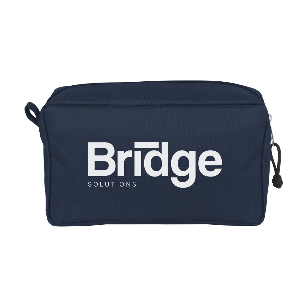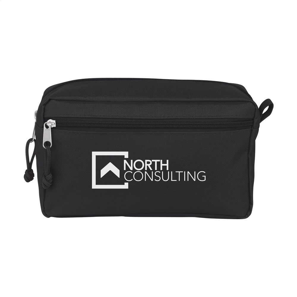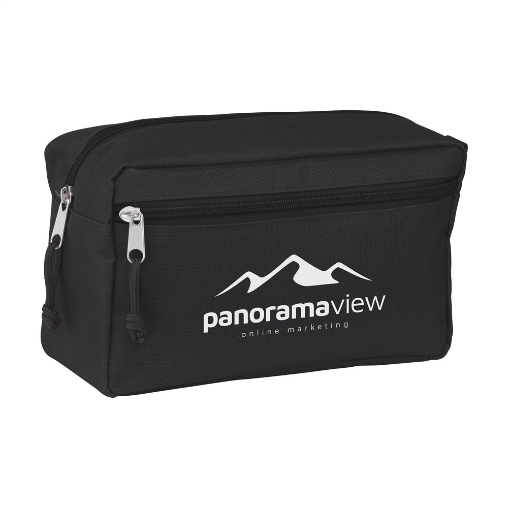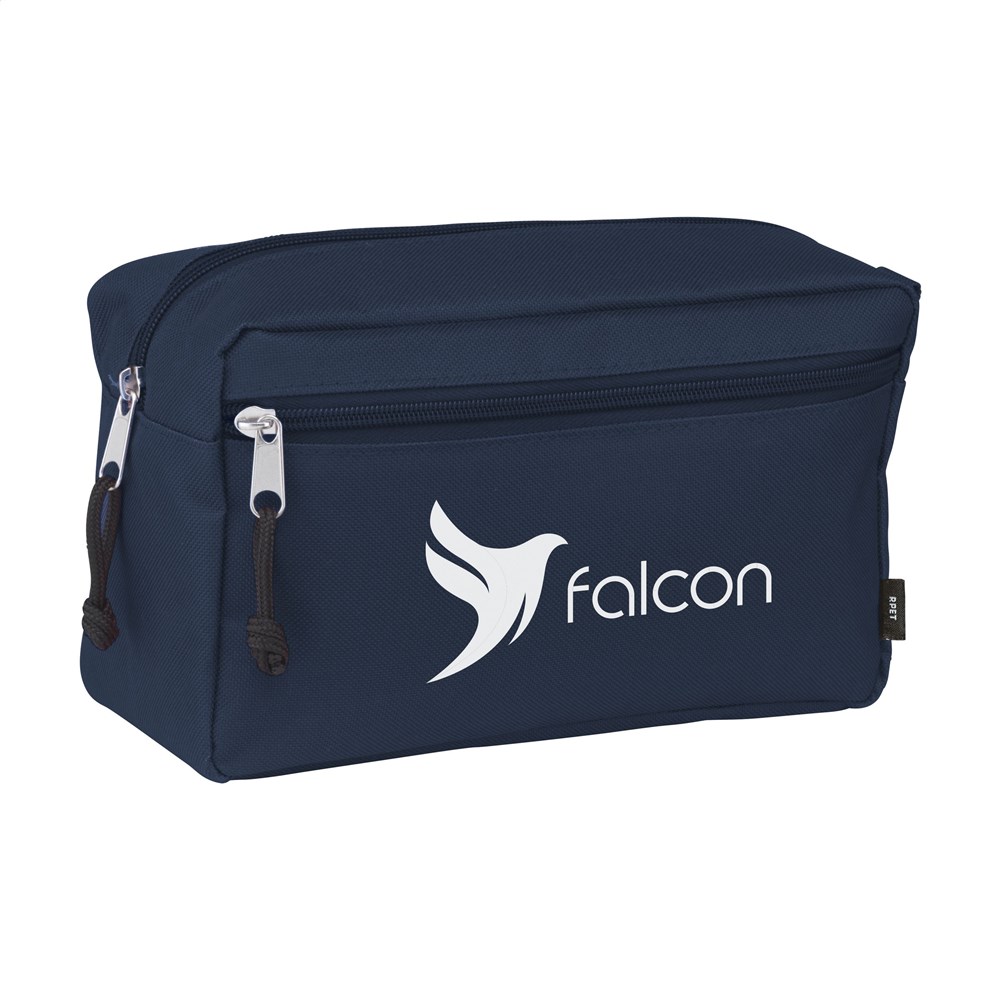WoW! Royaal etui voor het opbergen van make-up of toiletartikelen. Gemaakt van 600D RPET polyester; gerecycled materiaal van PET-flessen en textielvezels. Met ophanglus en extra ritsvak.