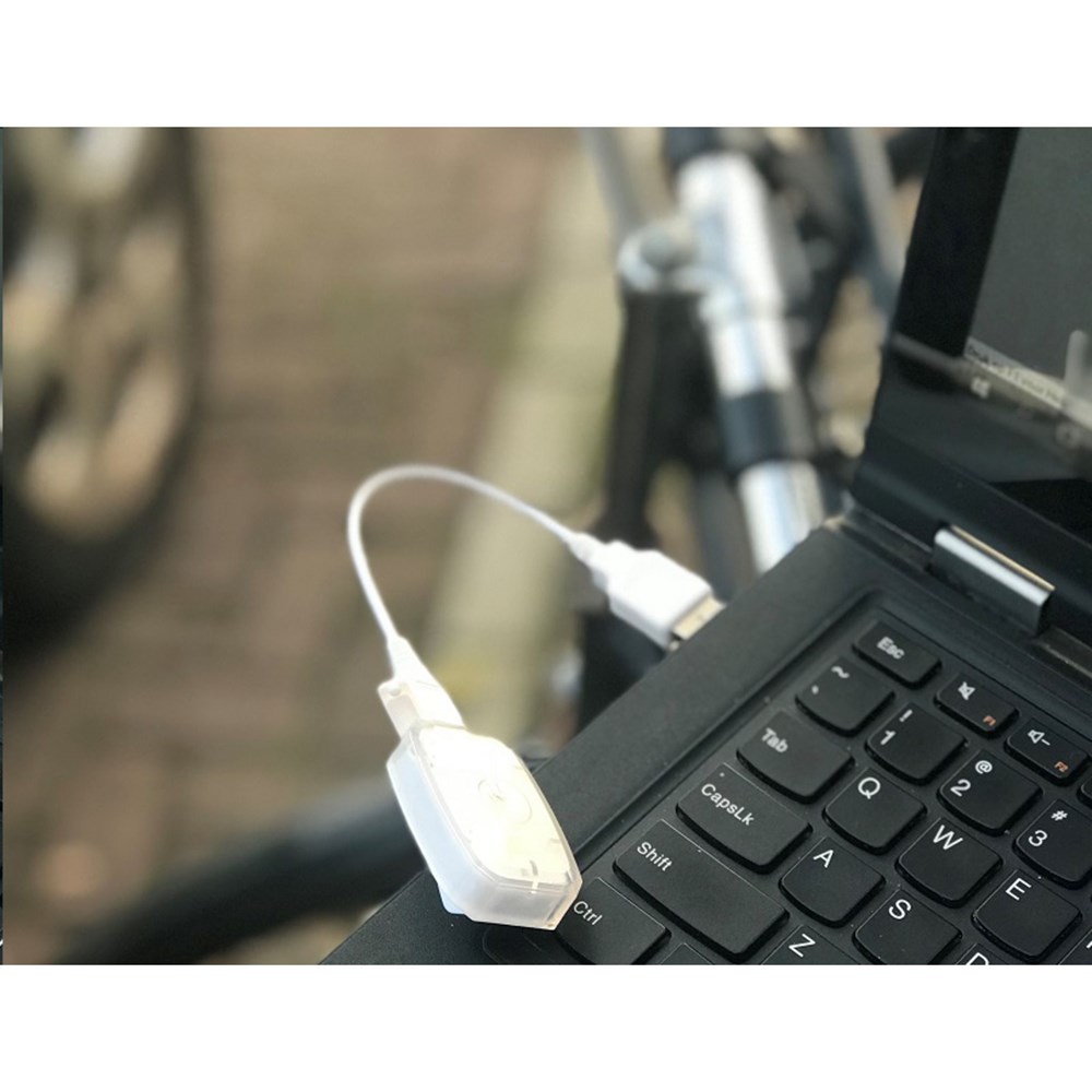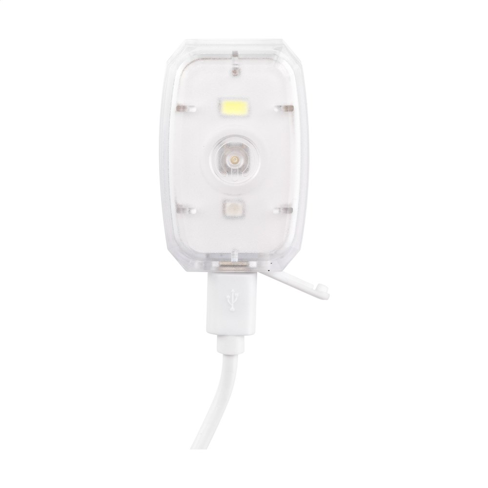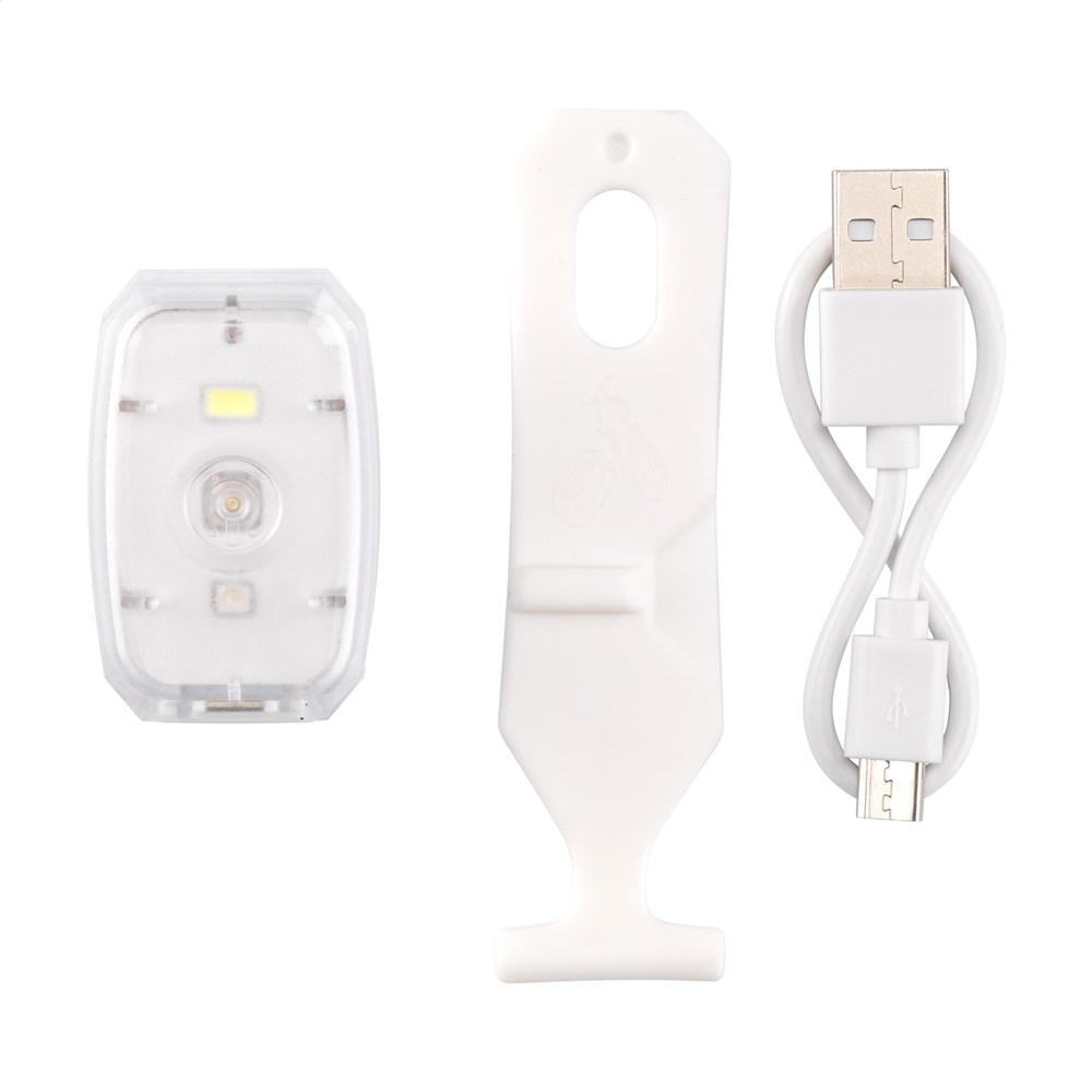 WoW! Oplaadbaar LED fietslampje met krachtige lichtbundel. Met 4 lichtstanden: wit continue licht, wit knipperlicht, rood continu licht, rood knipperlicht. De fietslamp kan worden bevestigd aan het stuur, aan het zadel of zelfs aan je broek en voorziet je van licht tijdens het fietsen of hardlopen in het donker. Veiligheid voor alles. Zorg dat je gezien wordt. Inclusief Lithium-Ion batterij. Per stuk in kraft doos.