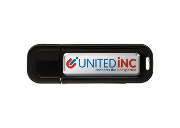 Compacte USB 2.0 flash drive met tweezijdige doming inclusief full-colour bedrukking. Leverbaar uit voorraad in wit en zwart. Standaard in een witte geschenkverpakking geleverd. Prijzen zijn exclusief de wettelijk verplichte €0,50 thuiskopieheffing.