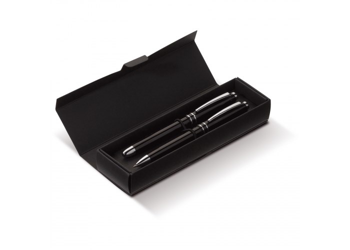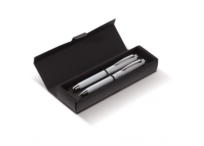 Metalen schrijfset met balpen en rollerbal. Balpen met twistfunctie. Rollerball voorzien van dop. Blauwschrijvend. Stijlvolle schuine bovenkant met twee zilverkleurige ringen.