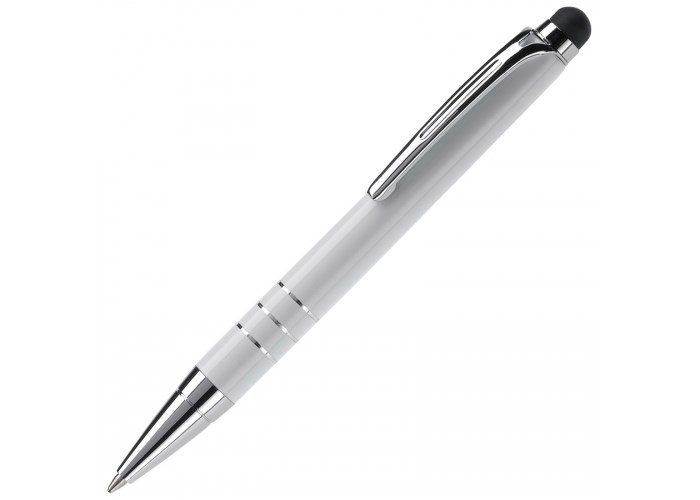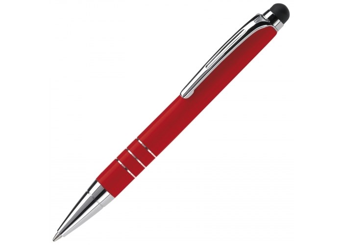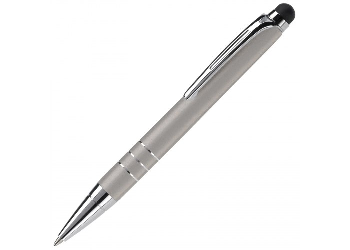 Kleine, aluminium balpen met touchscreen bovenkant. Pen is voorzien van draaimechanisme.
