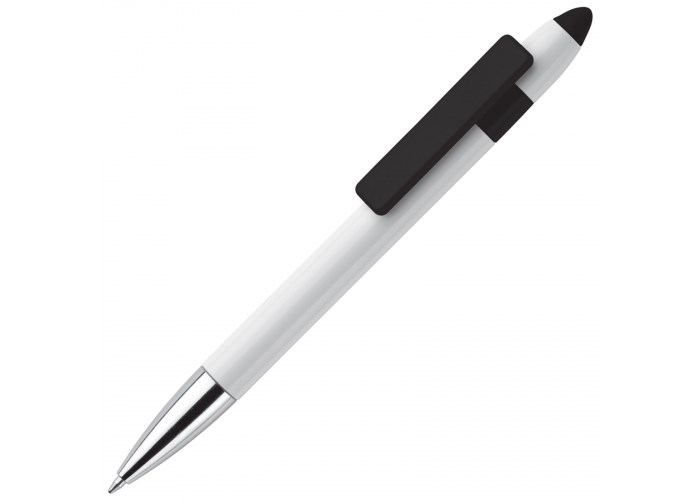 Styluspen California met gemetaliseerde tip. De houder is wit, de clip en stylus zijn in meerdere moderne kleuren verkrijgbaar. Robuuste pen met draaimechanisme. De clip is geschikt voor digitale druk.