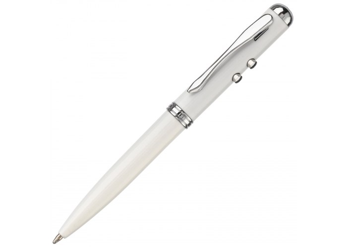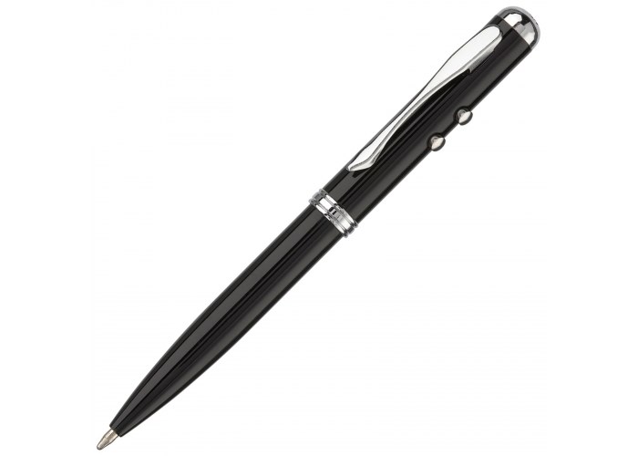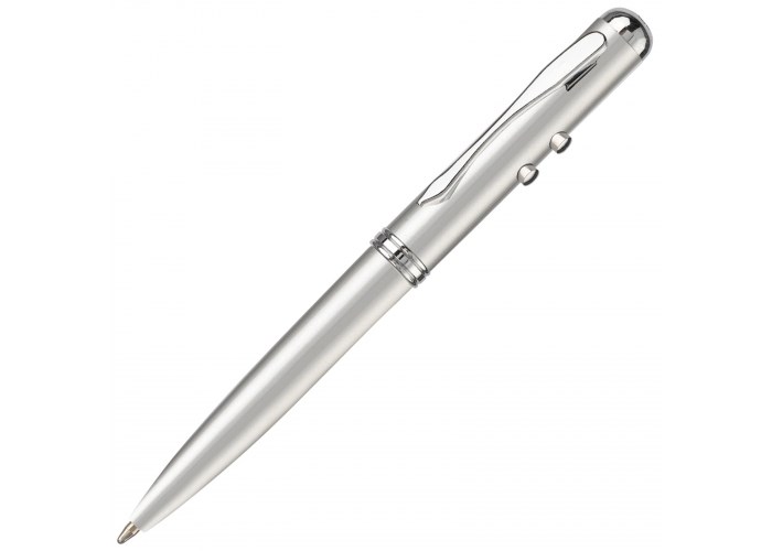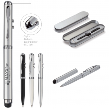 Metalen 4-in-1 balpen inclusief laser pen, stylus en lampje. Te gebruiken als balpen door de dop af te nemen. Wordt geleverd in geschenkverpakking met drie batterijen. Zwartschrijvend.
