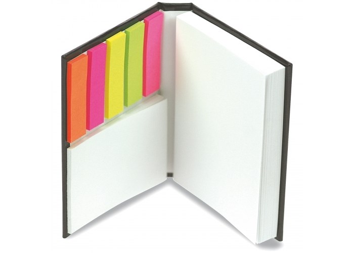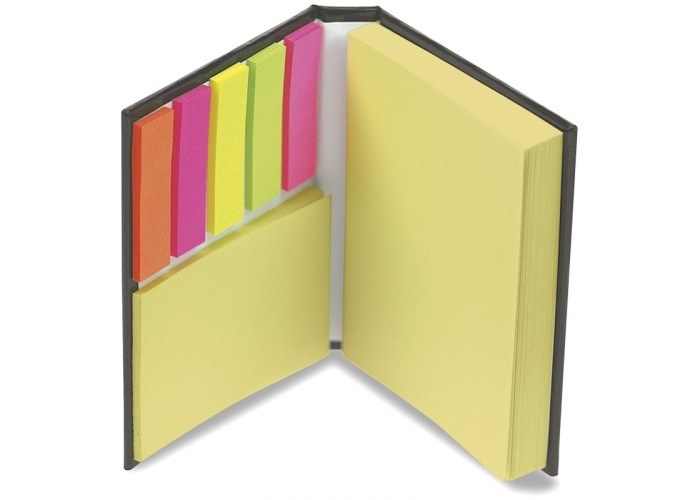 Klein notitieboekje met 100 zelfklevende grote memoblaadjes (100x75mm), 25 kleine zelfklevende memoblaadjes (50x75mm) en vijf 25 kleurige opmerkingenblaadjes. Groot drukoppervlak op de voor- en achterzijde.
