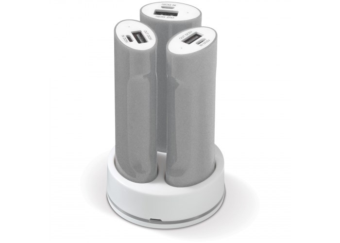 Set van drie powerbanks (2200mAh) die samen in één docking station kunnen worden opgeladen. Laadt in één keer meerdere apparaten op. Ideaal wanneer meerdere powerbanks gebruikt worden op reis. Powerbanks zijn ook per stuk op te laden.