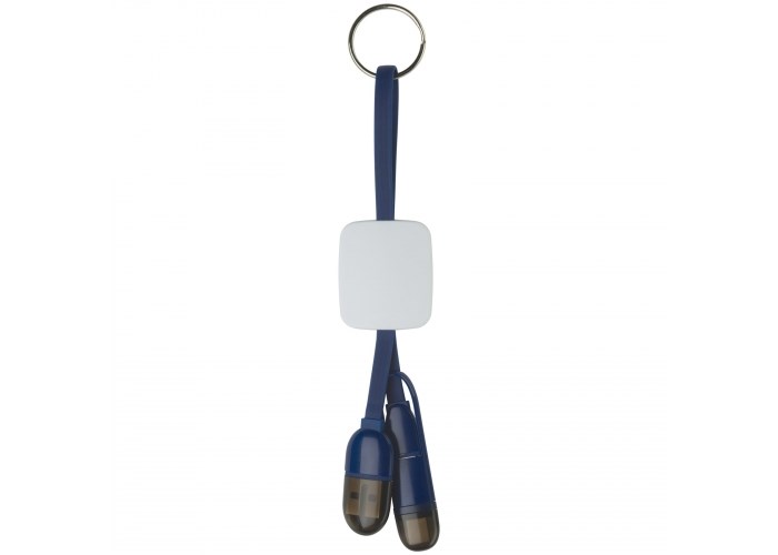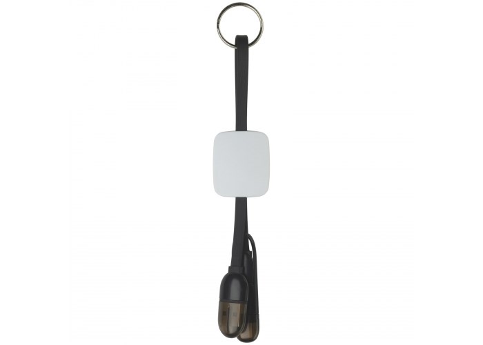 Sleutelhanger met USB-, Micro-USB- en Type-C aansluiting. Handige gadget om mobiele apparaten mee op te laden. Het witte vierkant zorgt voor een perfect en opvallend bedrukkingsoppervlak.