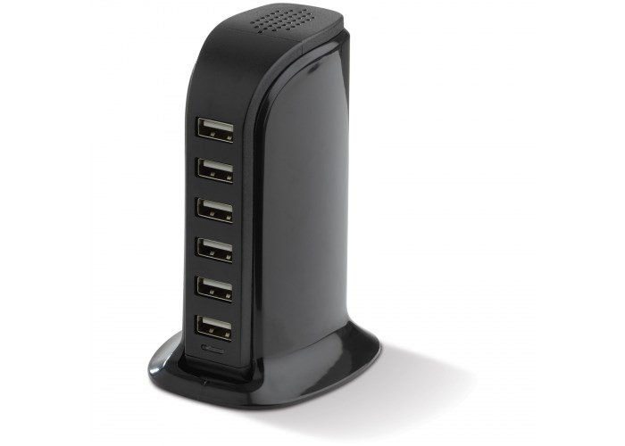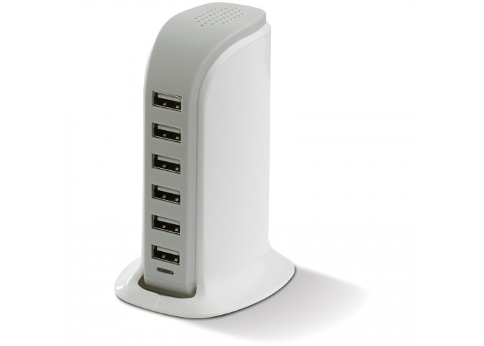Adapter met zes USB uitgangen met een output van 6A waarmee meerdere apparaten tegelijk kunnen worden opgeladen.