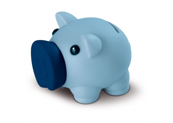 Klein spaarvarken van kunststof. Geschikt voor onder andere (spaar)banken. Vanaf 5.500 stuks custom-made kleuren mogelijk.