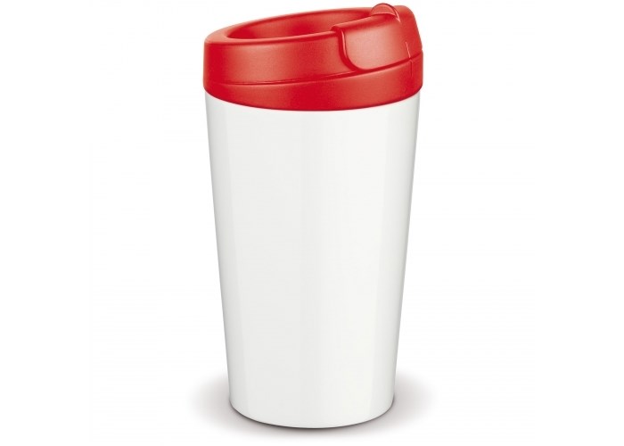 Dubbelwandig kunststof mok uit de Flavour serie met een hard kunststof deksel. Goed afsluitbaar en comfortabel uit te drinken door uitsparing in het deksel. De mok voelt niet heet aan dankzij de dubbele wand.