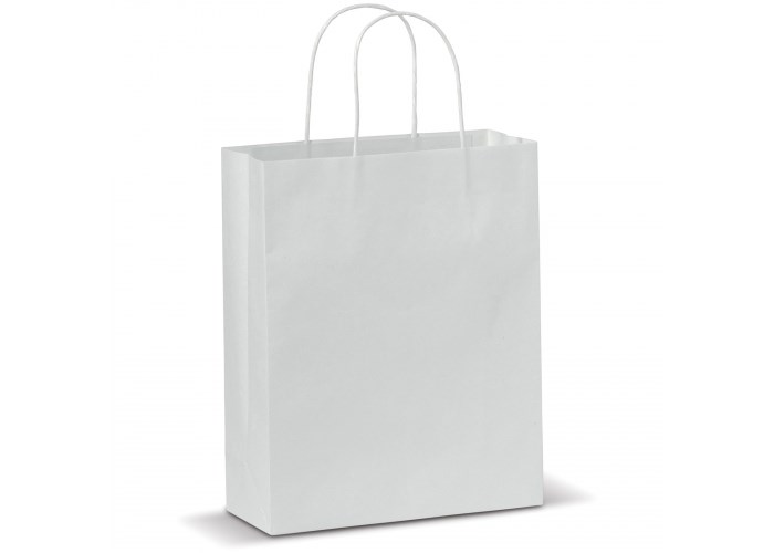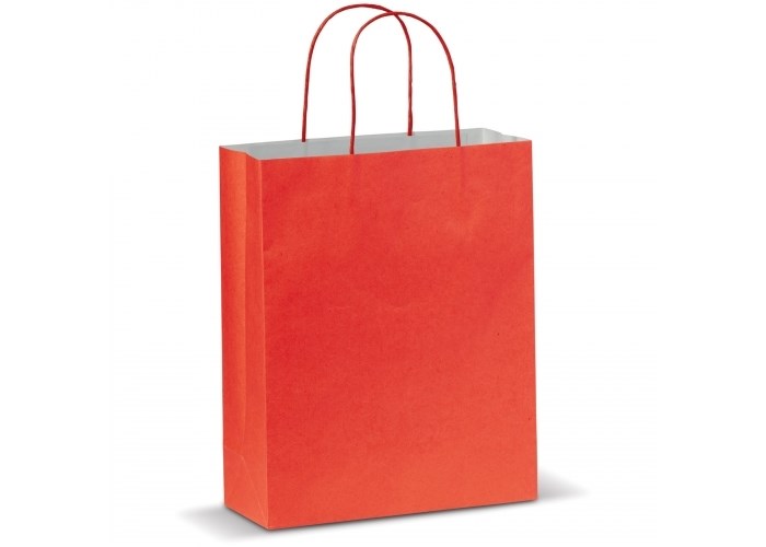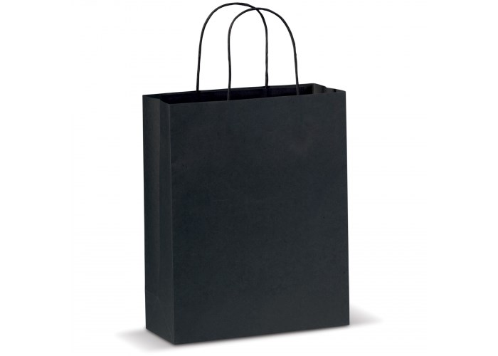 Middelgrote mat papieren draagtas met hengsels van gedraaid papier. Tas heeft een ecologische look. Geschikt als geschenk- en cadeautas. FSC-gecertificeerd.