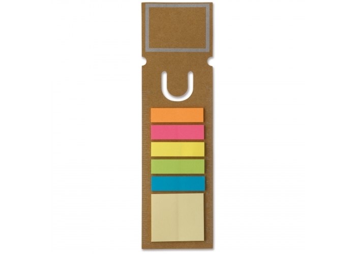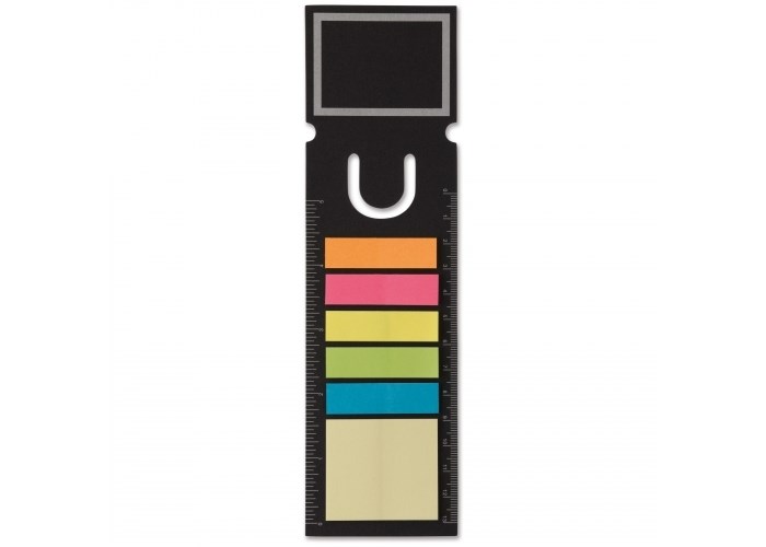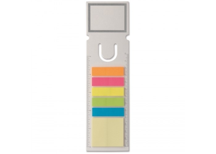 Boekenlegger met vierkante bovenkant, voorzien van vijftien zelfklevende memoblaadjes per kleur/formaat. Vijf kleuren memoblaadjes (44X12mm) en één soort grote memoblaadjes (44X40mm).