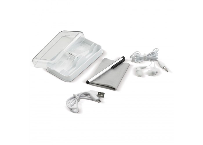 Mooie giftset met een microvezel schoonmaakdoekje voor de smartphone (115x155mm), stylus, oordopjes en een oplaadkabel Micro-USB naar USB. Een handige set voor onderweg.