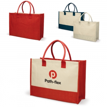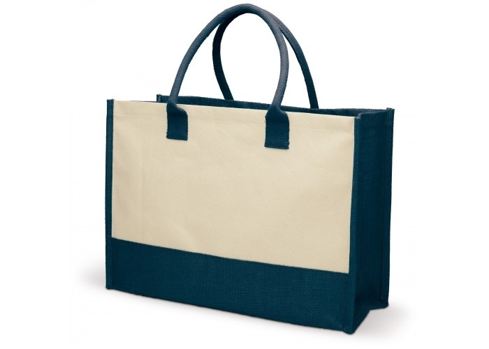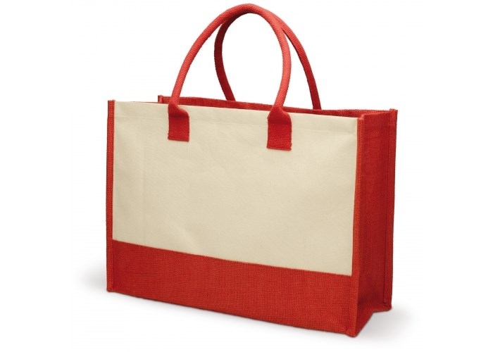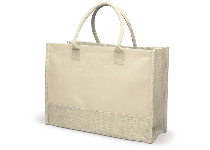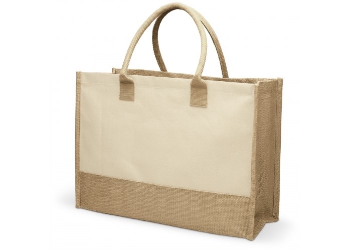 Stevige boodschappentas gemaakt van een uitstekende mix tussen jute en canvas. Met katoenen handvatten.