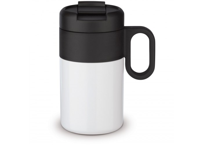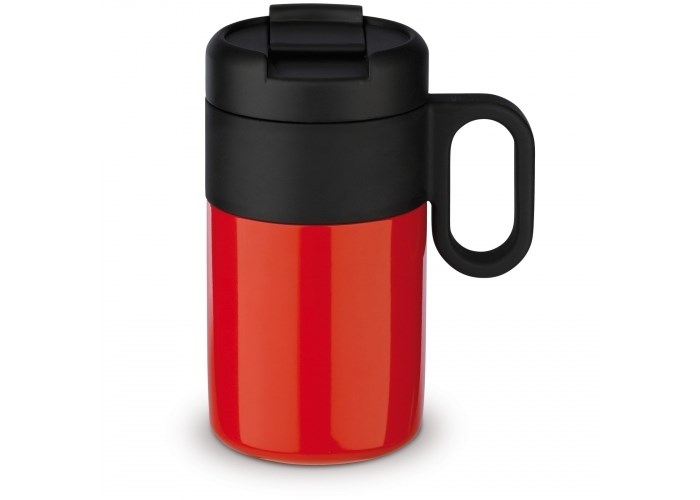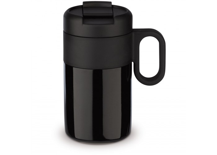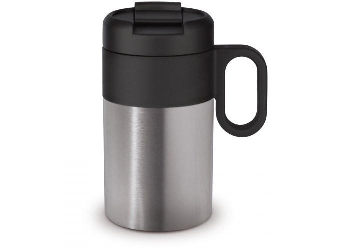 Dubbelwandig vacuüm geïsoleerde beker uit de 'Flow' serie. De mok met omklapdeksel is 100% lekvrij en eenvoudig mee te nemen. Zowel de binnenwand als de buitenwand van de mok bestaan uit RVS en is van zeer hoogwaardige kwaliteit. Daardoor blijft het drinken langer op de gewenste temperatuur.
