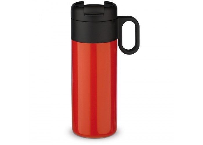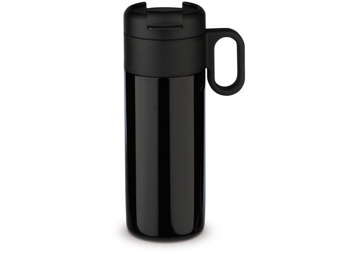 Dubbelwandig vacuüm geïsoleerde beker uit de 'Flow' serie. De mok met omklapdeksel is 100% lekvrij en eenvoudig mee te nemen. Zowel de binnenwand als de buitenwand van de mok bestaan uit RVS en is van zeer hoogwaardige kwaliteit. Daardoor blijft het drinken langer op de gewenste temperatuur.