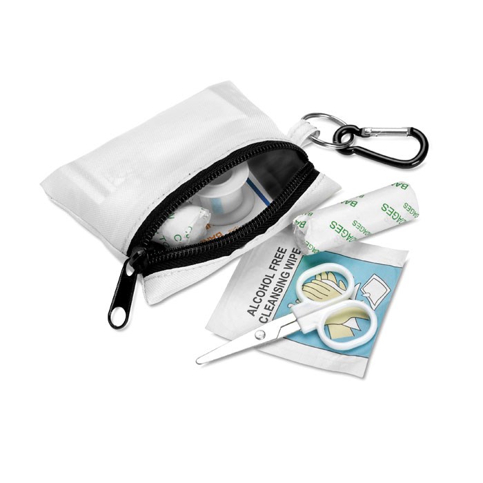 Eerste hulpsetje compleet met schaar, verbandgaas, rol watten, 5 pleisters en vochtig doekje. Alles in een neonkleurig polyester tasje met karabijnhaak.
