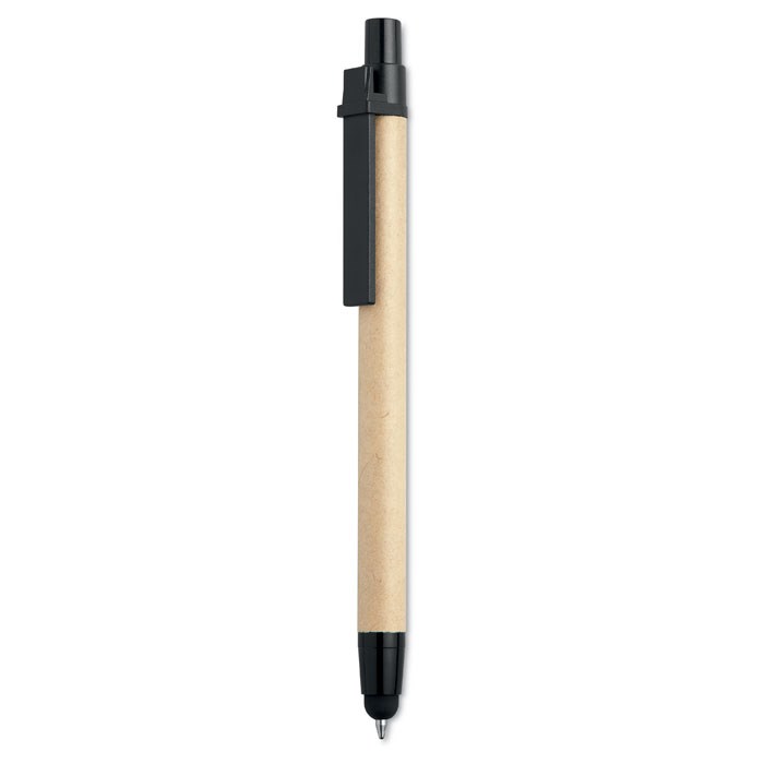 Balpen met drukmechanisme en een behuizing gemaakt van gerecycled karton, met een ABS punt en clip. Navulbaar, blauwe inkt en touch pen voor touchscreens.