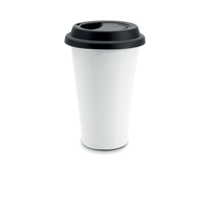 Keramische, dubbelwandige reisbeker met siliconen deksel. Ideaal voor warme dranken, niet geschikt voor in de magnetron. Tampondruk is niet vaatwasserbestendig. Keramische transfer is vaatwasserbestendig. Inhoud 275 ml.
