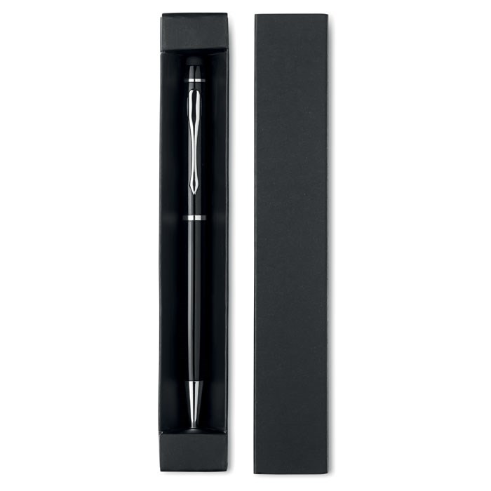 Aluminium balpen (draaimechanischme) en touch pen, voor touchscreens, in kartonnen geschenkverpakking. Blauwe inkt.