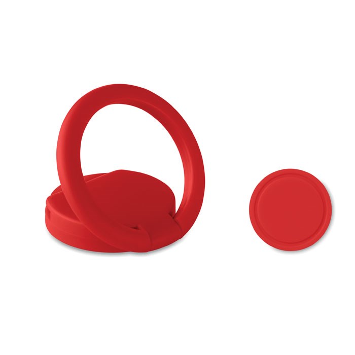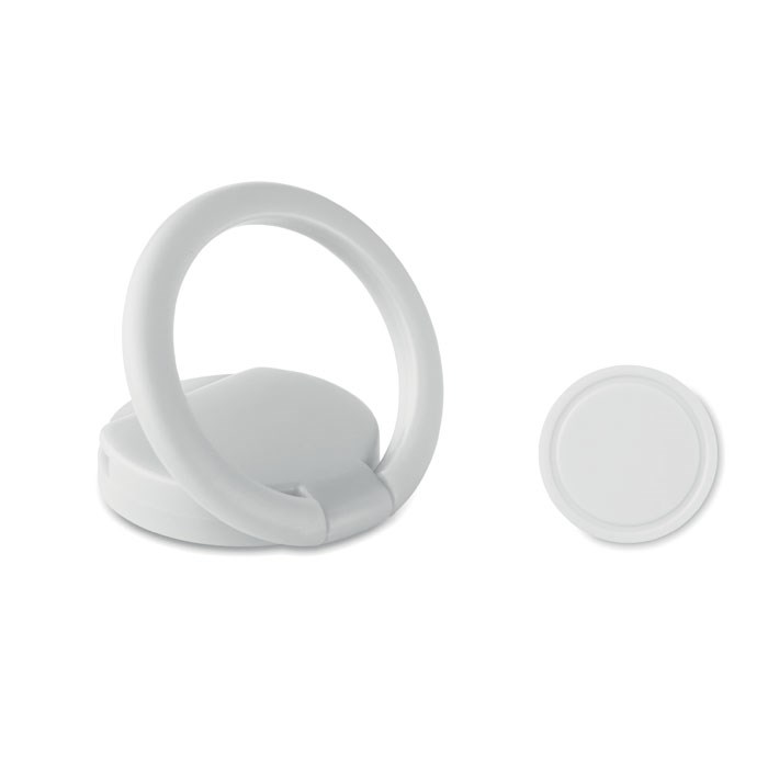 ABS telefoonhouder met ring en functioneert tevens als standaard. Met winkelwagenmuntje. 3M sticker aan de achterzijde.