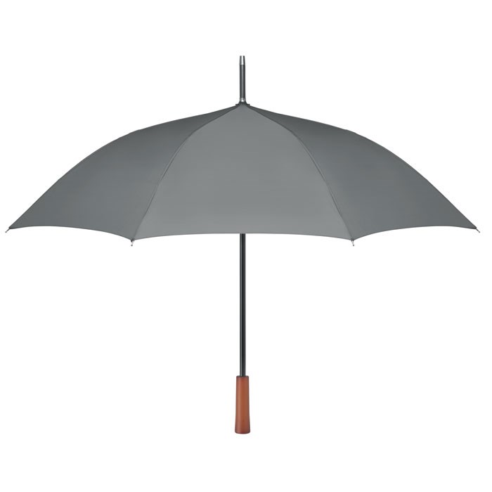 23 Inch paraplu van 190T RPET pongee. Zwart metalen frame en baleinen en houten handvat. Opent automatisch en sluit handmatig.