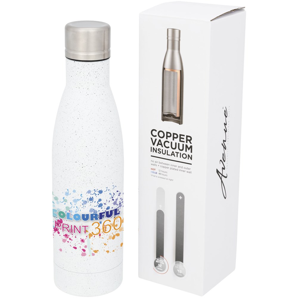 Houd uw dranken 12 uur warm of 48 uur koud met de Vasa gespikkelde koper vacuüm geïsoleerde fles. Dubbelwandig en van 18/8 roestvrij staal met vacuümisolatie en een verkoperde binnenwand, dus uw drankje blijft gloeiend heet of ijskoud, net wat u wilt. De fles heeft een trendy, gespikkelde afwerking. Capaciteit is 500ml. Gepresenteerd in een Avenue geschenkverpakking.
