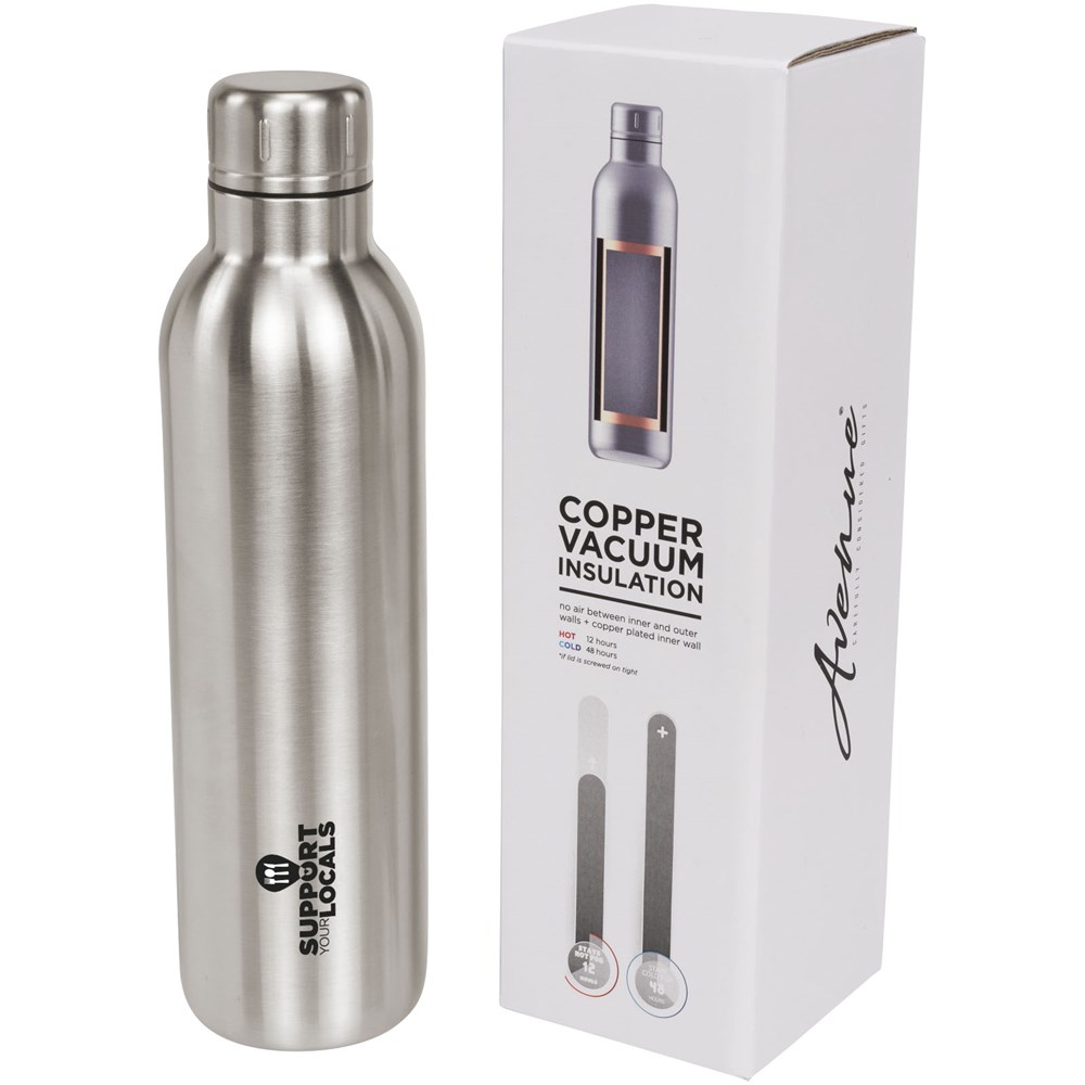Duurzame dubbelwandige roestvrijstalen koper vacuümcisolatie, waardoor je drank 48 uur koel blijft en minstens 12 uur voor warme dranken. De constructie voorkomt ook condensatie aan de buitenzijde van de fles. On-trend, duurzame poedercoating. Roestvrijstalen schroefbare morsbestendige deksel. Inhoud 510 ml. Geleverd in een Avenue geschenkverpakking.