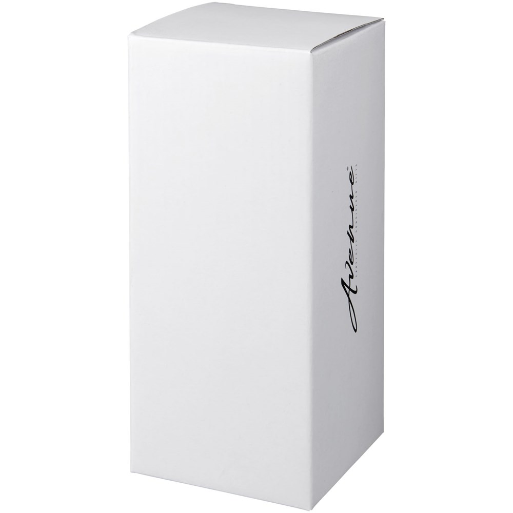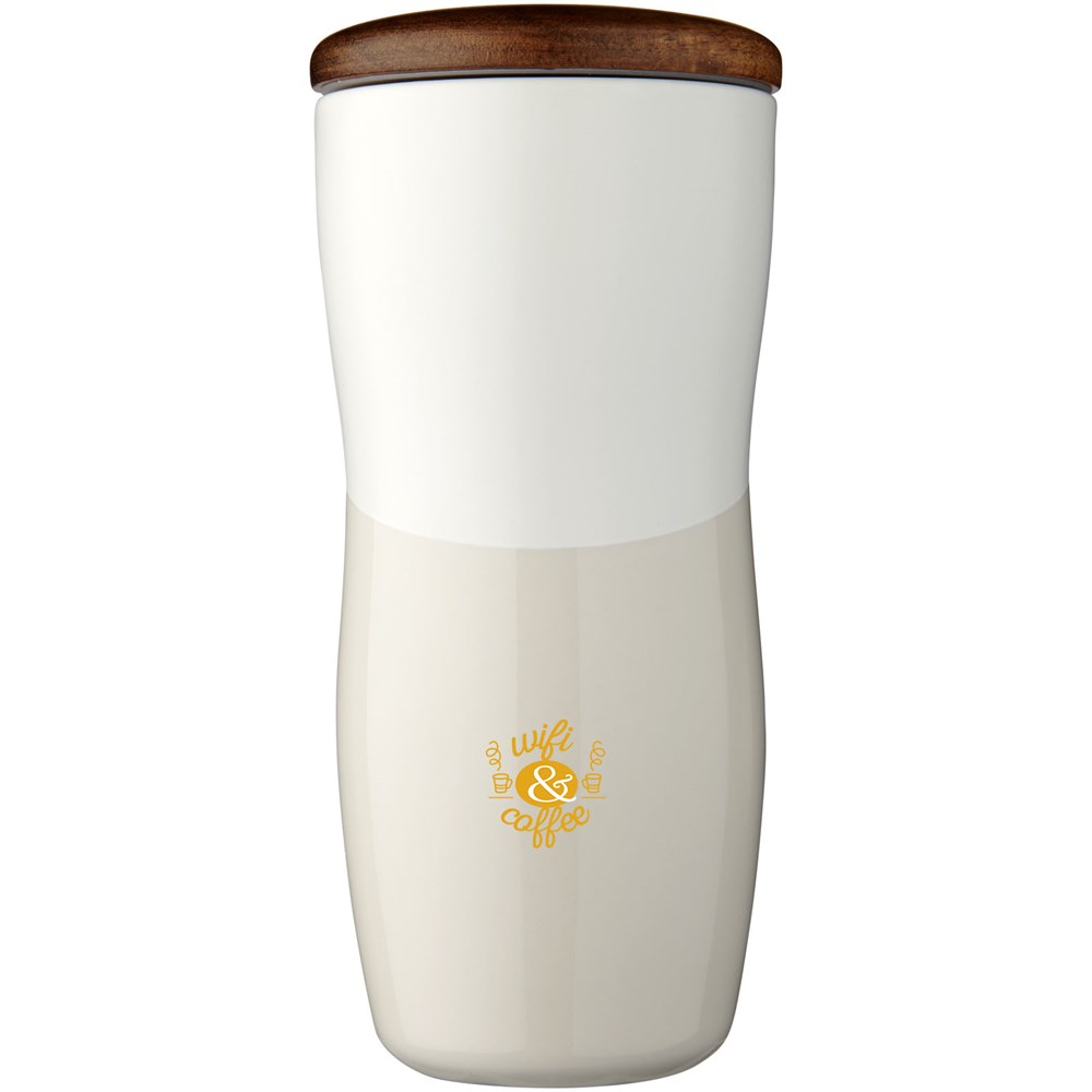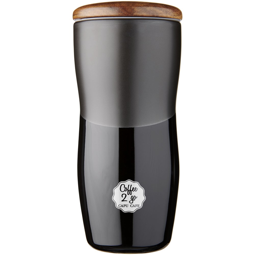 Dubbelwandige keramische beker met contrasterend mat en glanzend design. De dubbelwandige keramische constructie voorkomt ook condensatie aan de buitenkant van de beker. Voorzien van een houten drukdeksel. De capaciteit is 370ml. Gepresenteerd in een Avenue geschenkverpakking.