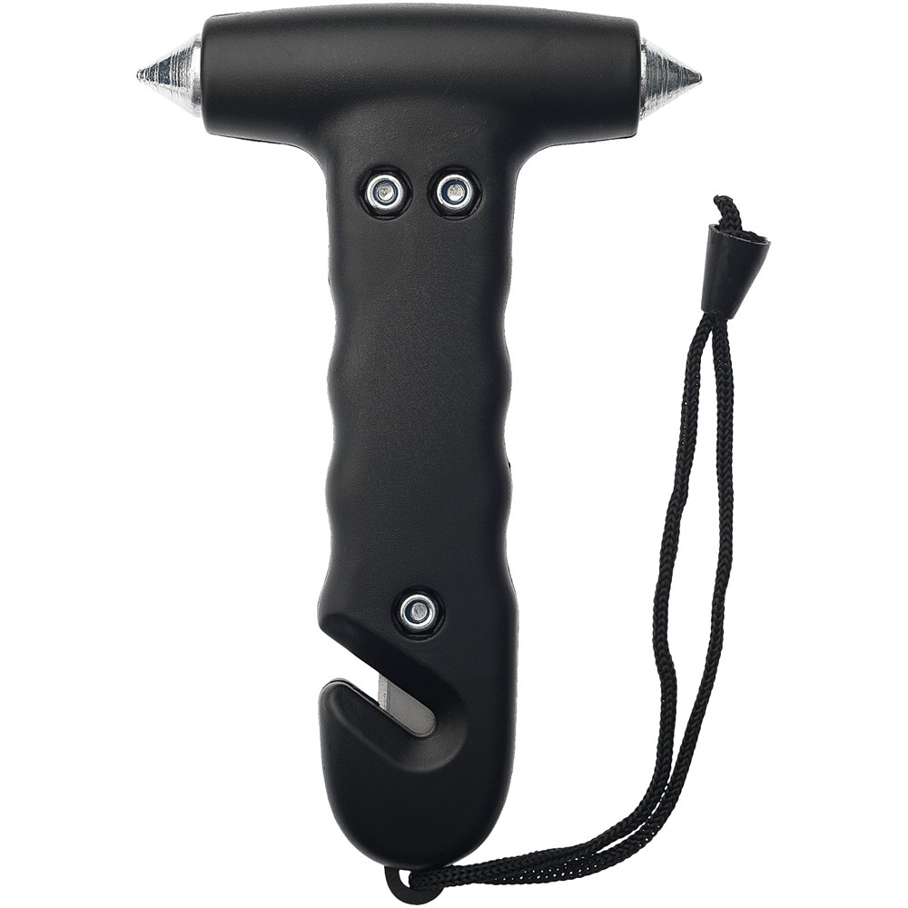 Noodhamer met polsband en geïntegreerde gordelsnijder in het handvat. Twee stalen ruitbrekers met geharde punt en gordelsnijder kunnen worden gebruikt om te ontsnappen in geval van problemen.