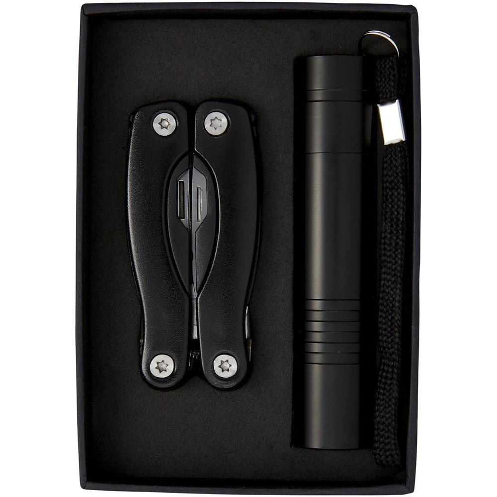 11 delige mini multi tool met LED zaklamp. Inclusief batterijen. Geleverd in een zwarte geschenkverpakking.