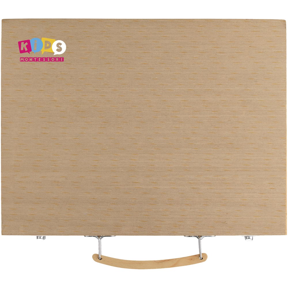 Deze set bestaat uit 12 kleuren waterverf, 12 kleurpotloden, 12 markers, 12 pastelkrijtjes, 12 waskrijtjes, pallet, lijm, gum, puntenslijper, HB potlood en penseel in een houten koffer. Decoratie is niet mogelijk op de losse onderdelen.