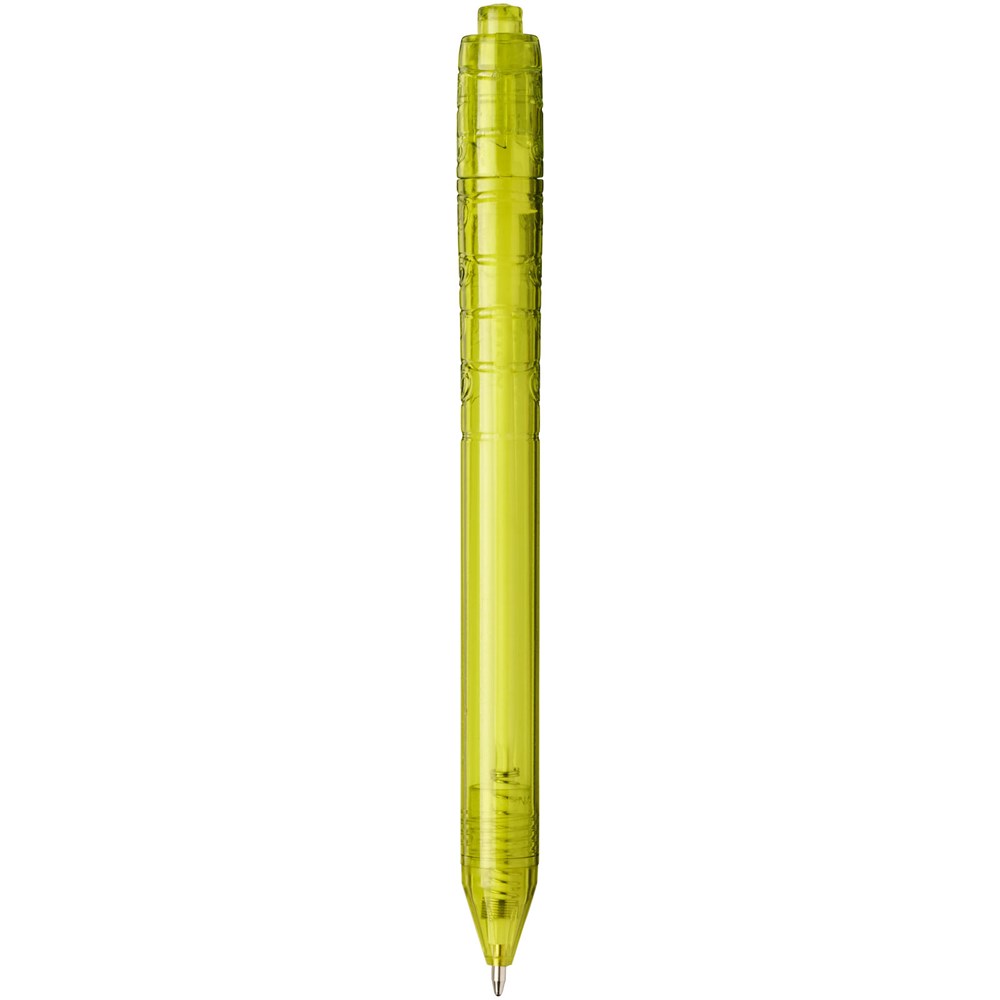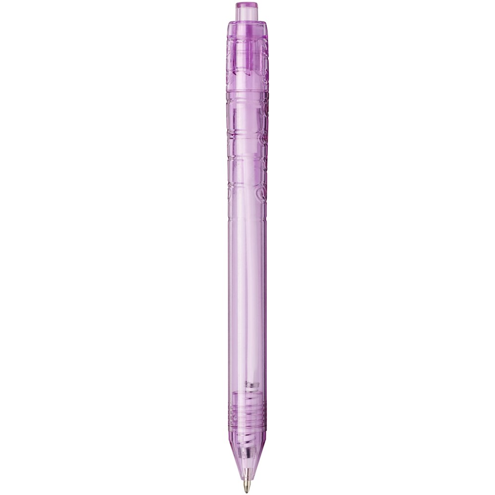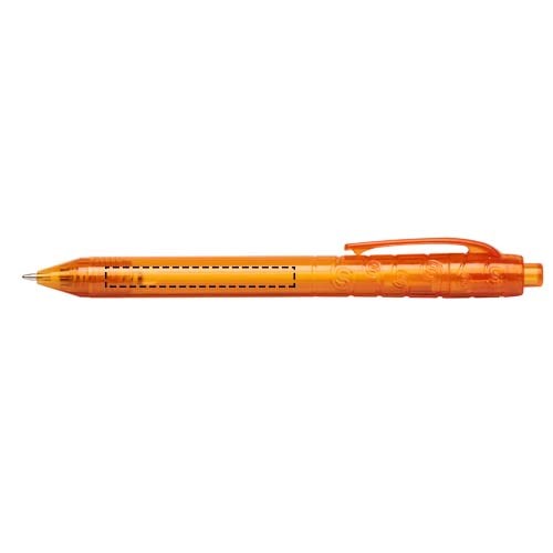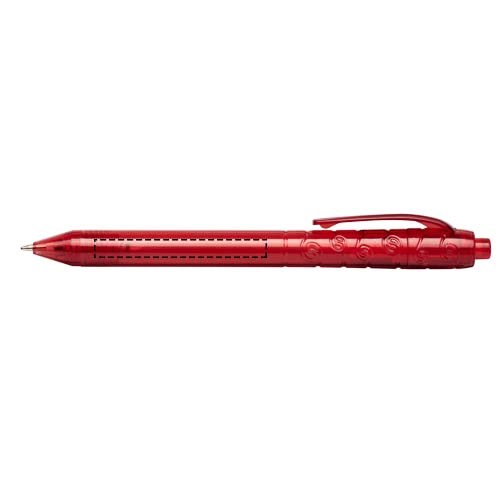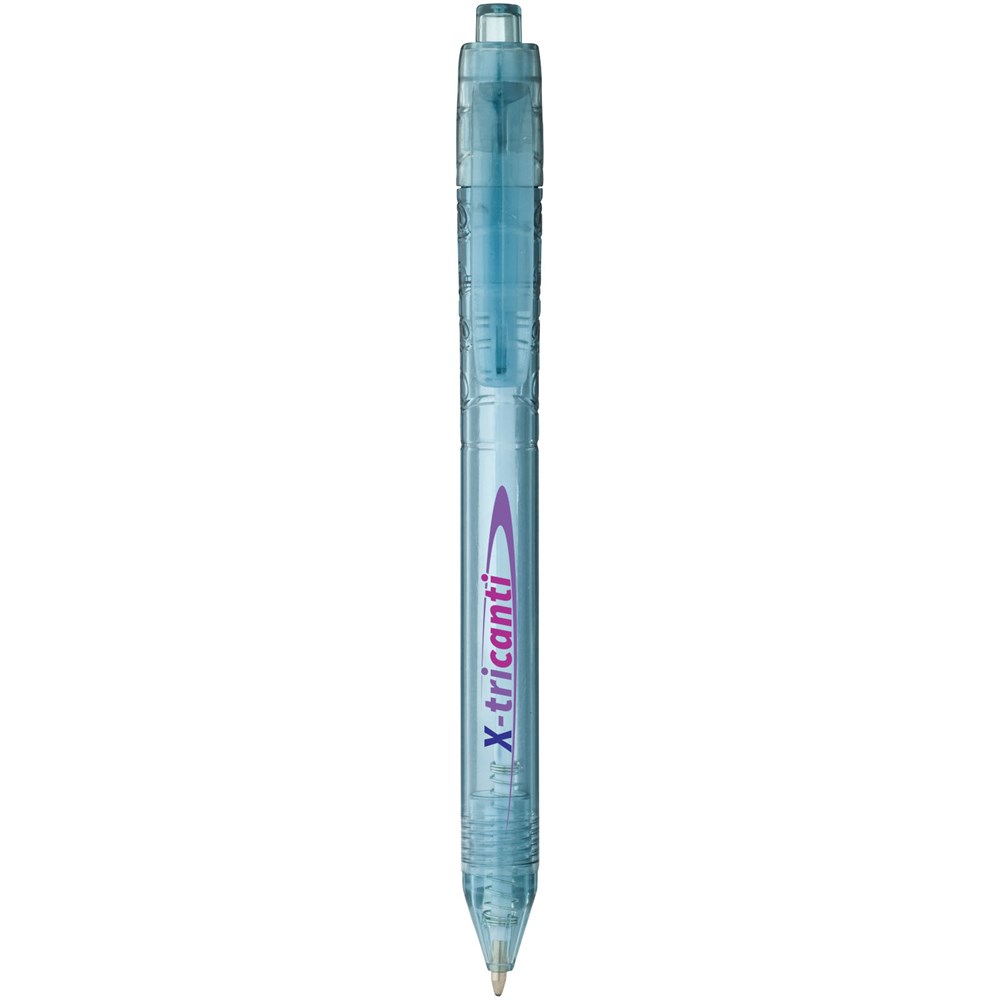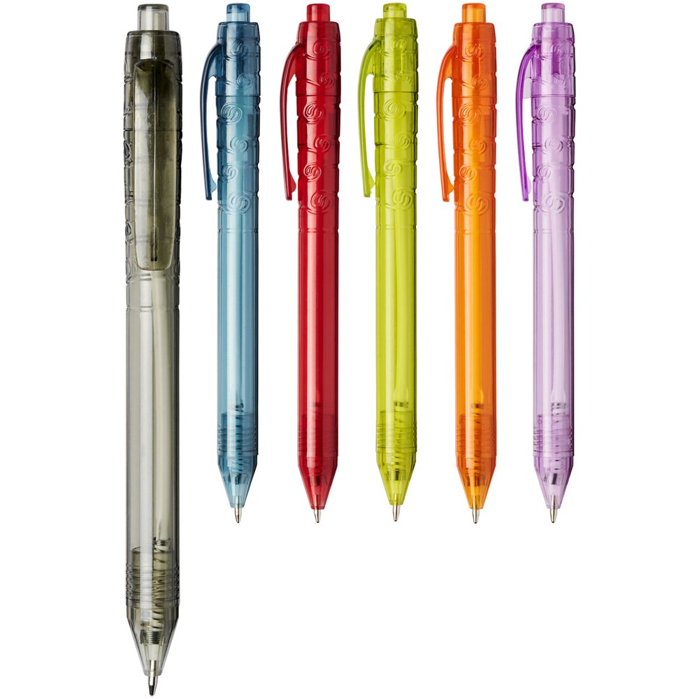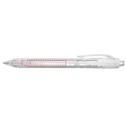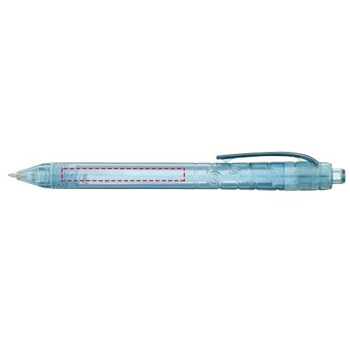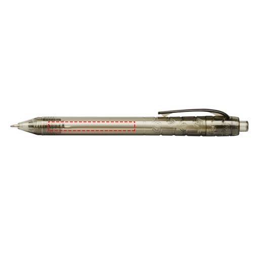 Balpen met klikmechanisme met een transparante huls. Het huls is gemaakt van gerecyclede waterflessen, wat bijdraagt aan het verminderen van de hoeveelheid plastic afval.
