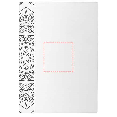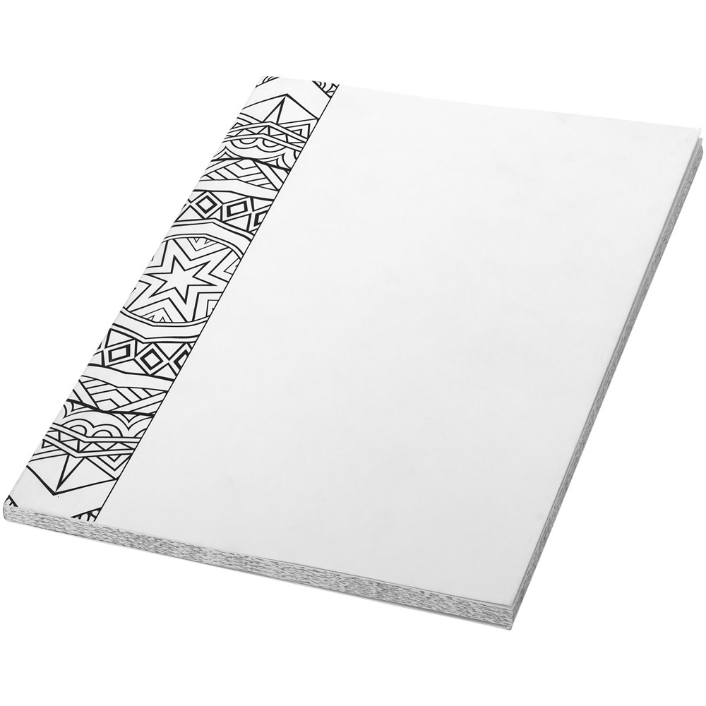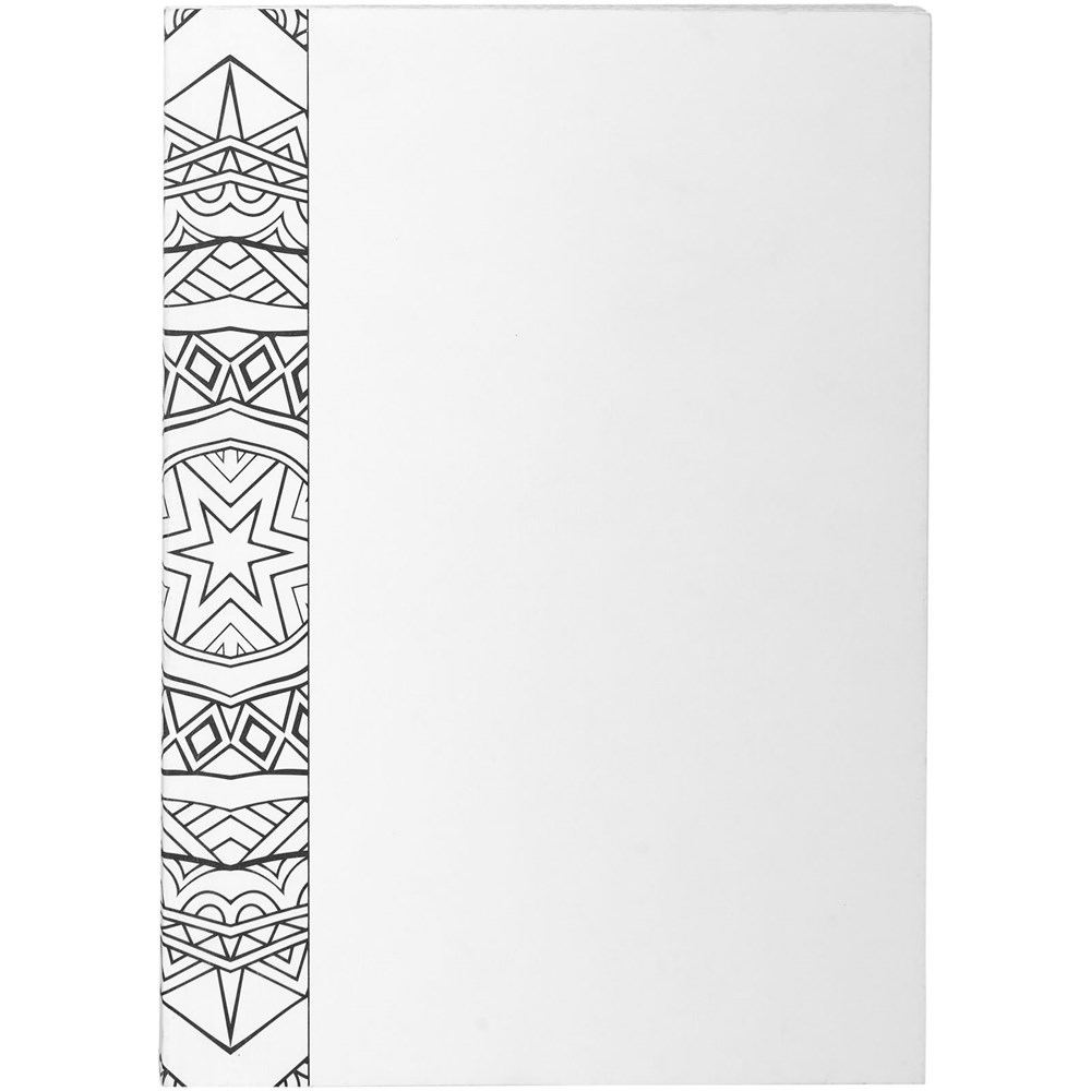 A5 formaat gebonden kleurboek met 40 pagina's van 100 gram. Omkeerbaar boekje met kleurpatronen aan de ene zijde en gelinieerde notitiepagina's aan de andere zijde.