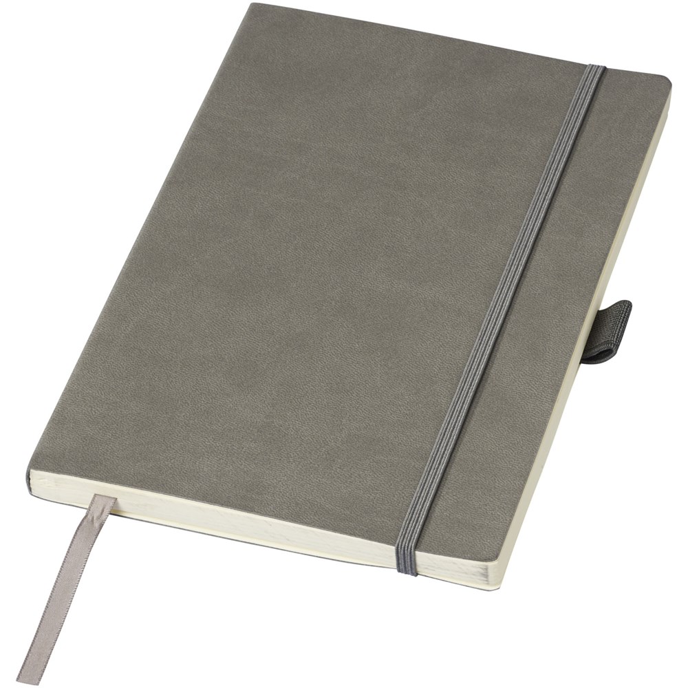 Flexibel notitieboekje (A5 formaat) met zacht aanvoelende kaft, geïntegreerde elastische sluiting, lint als bladwijzer, penlus, documentvak aan de binnenkant van de achteromslag en 80 vellen (80 g/m2) crèmekleurig gelinieerd papier. Verpakt in een zwarte hoes.