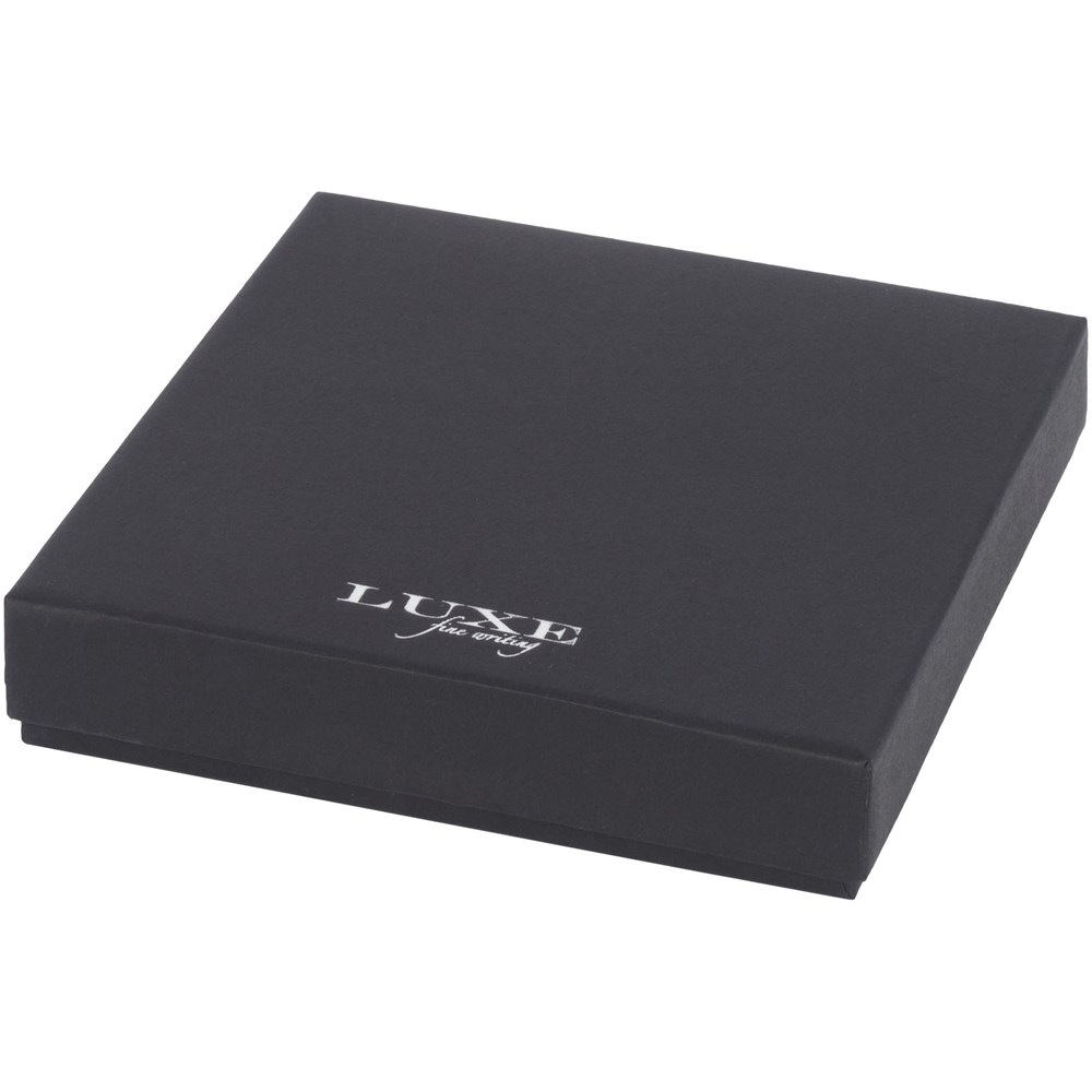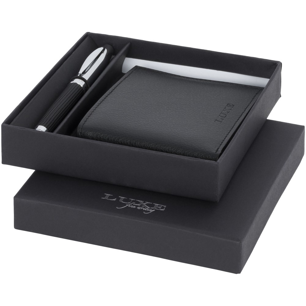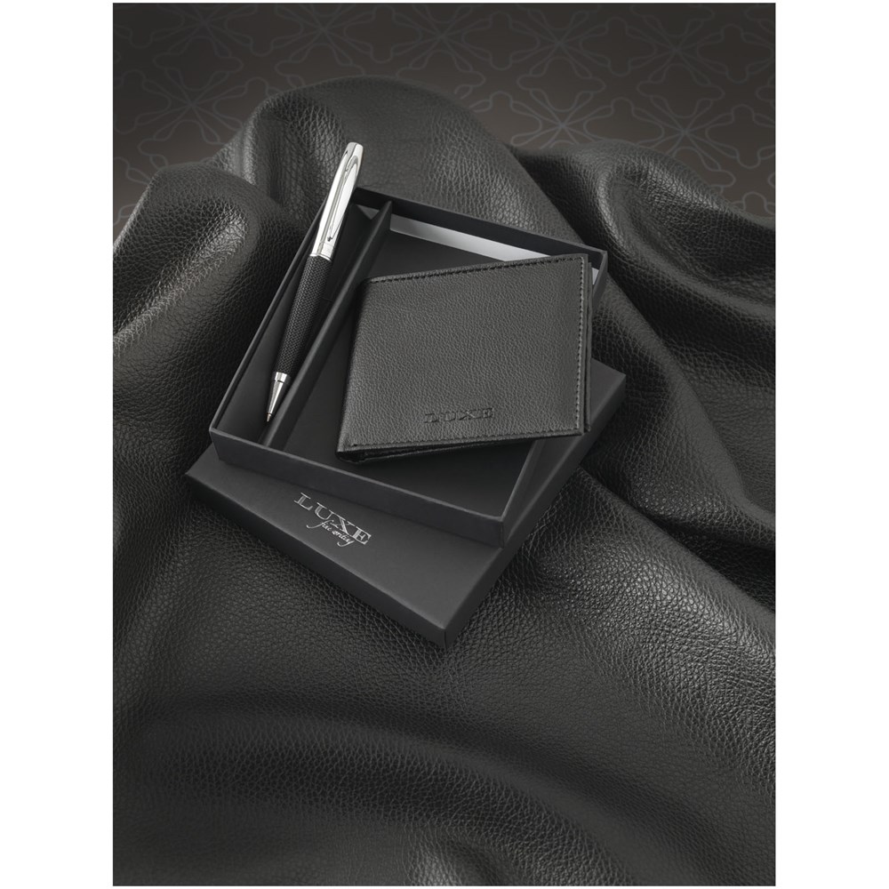 Twee onmisbare acessoires in één stijlvolle geschenkset. Balpen met leerbekleding en een bijpassende portefeuille. Exclusief ontwerp, geleverd in een ''LUXE'' geschenkverpakking.