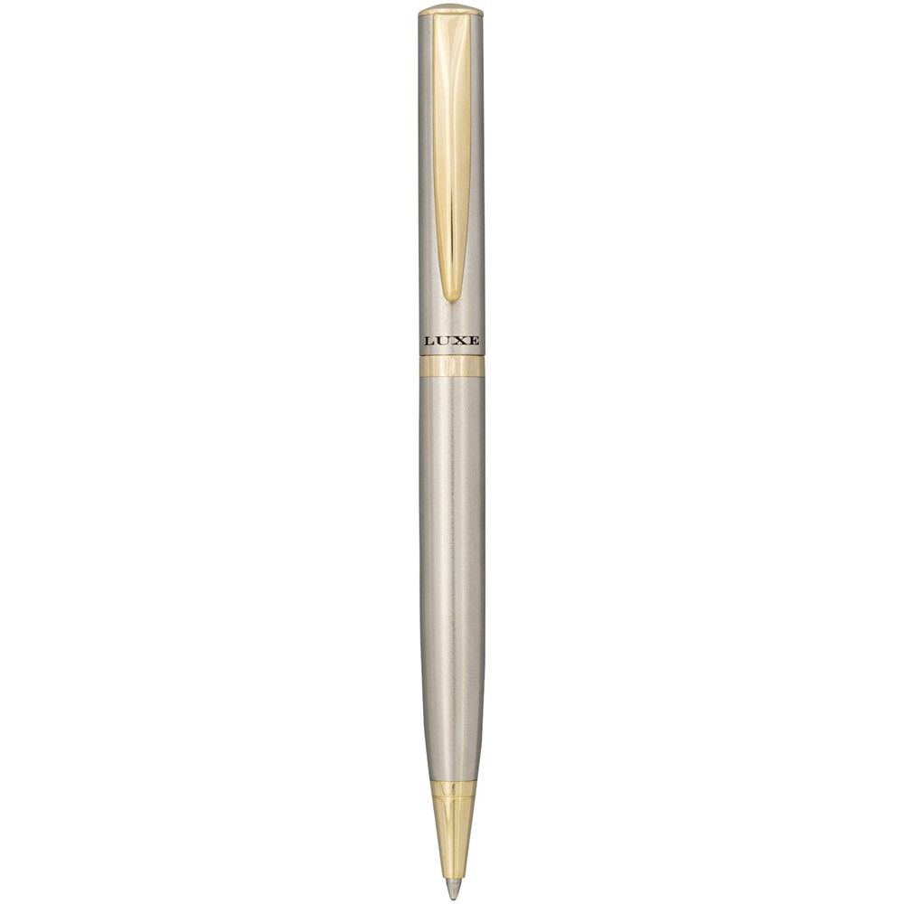 Lichtgewicht balpen met exclusief design, verkrijgbaar in mat geborstelde goudkleurige afwerking met goudkleurige accenten, en mat geborsteld zilver met chroomkleurige accenten. Incl. premium kwaliteit zwarte navulling en verpakt in een ''LUXE'' geschenkverpakking (16,5 x 4,5 x 2,8 cm).