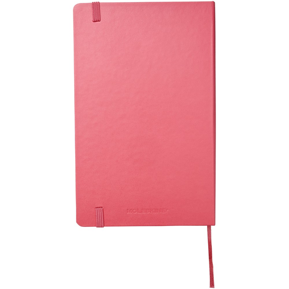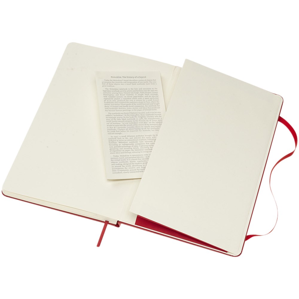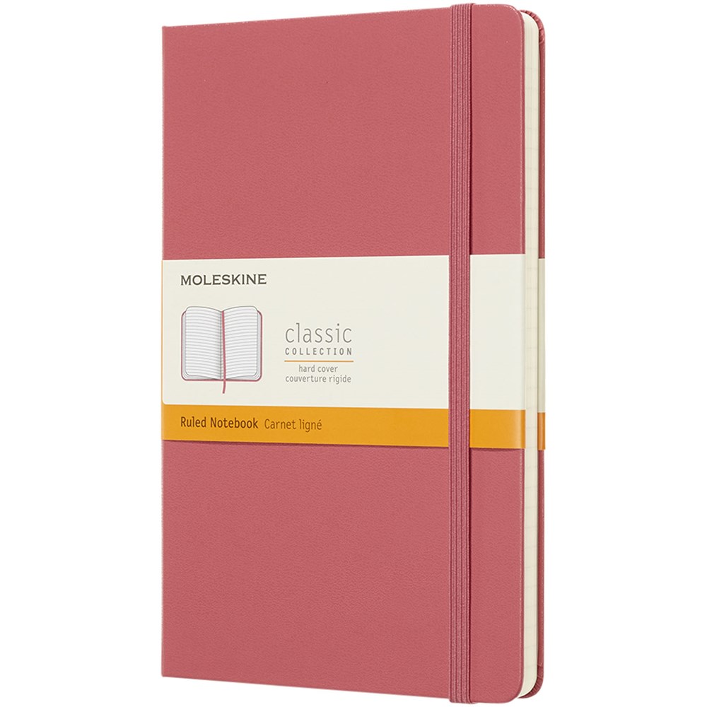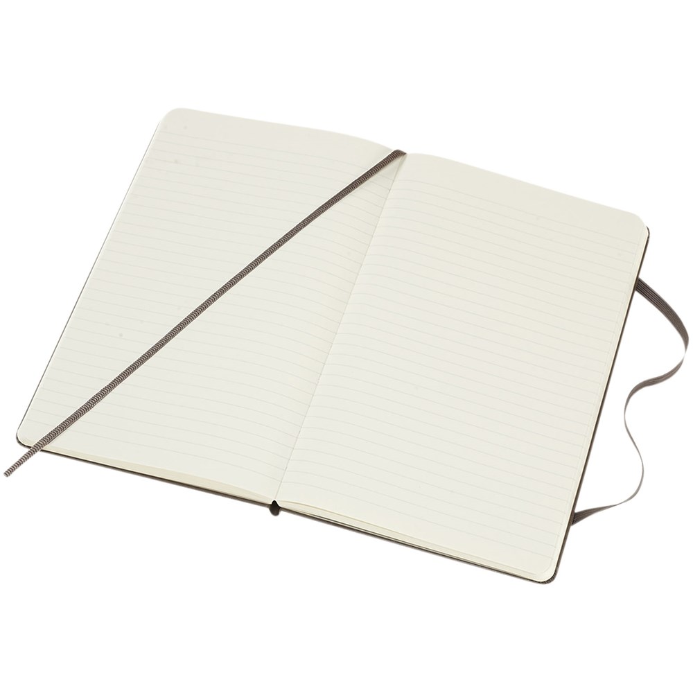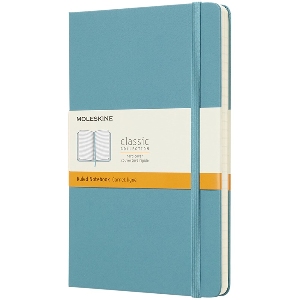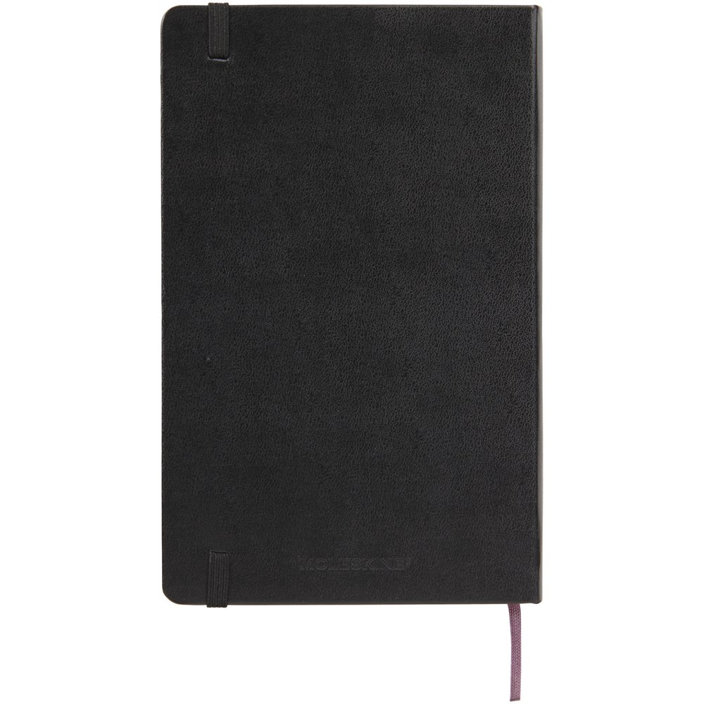 De Moleskine Classic large (13 x 21 cm) is voorzien van een harde omslag van gebonden karton met afgeronde hoeken, zuurvrij papier, een bladwijzer en een elastische sluiting. De eerste pagina biedt ruimte voor persoonsgegevens en het noteren van een beloning die de eerlijke vinder in geval van verlies ontvangt. Aan de achteromslag bevindt zich aan uitbreidbaar binnenvak met daarin de geschiedenis van Moleskine. Dit vak kan worden gebruikt voor losse papieren en notities. Bevat 240 ivoorkleurige gelinieerde pagina's. Pagina's zijn ook verkrijgbaar met stippen, ruitjes en in effen. Verkrijgbaar in diverse stijlvolle, levendige kleuren.
