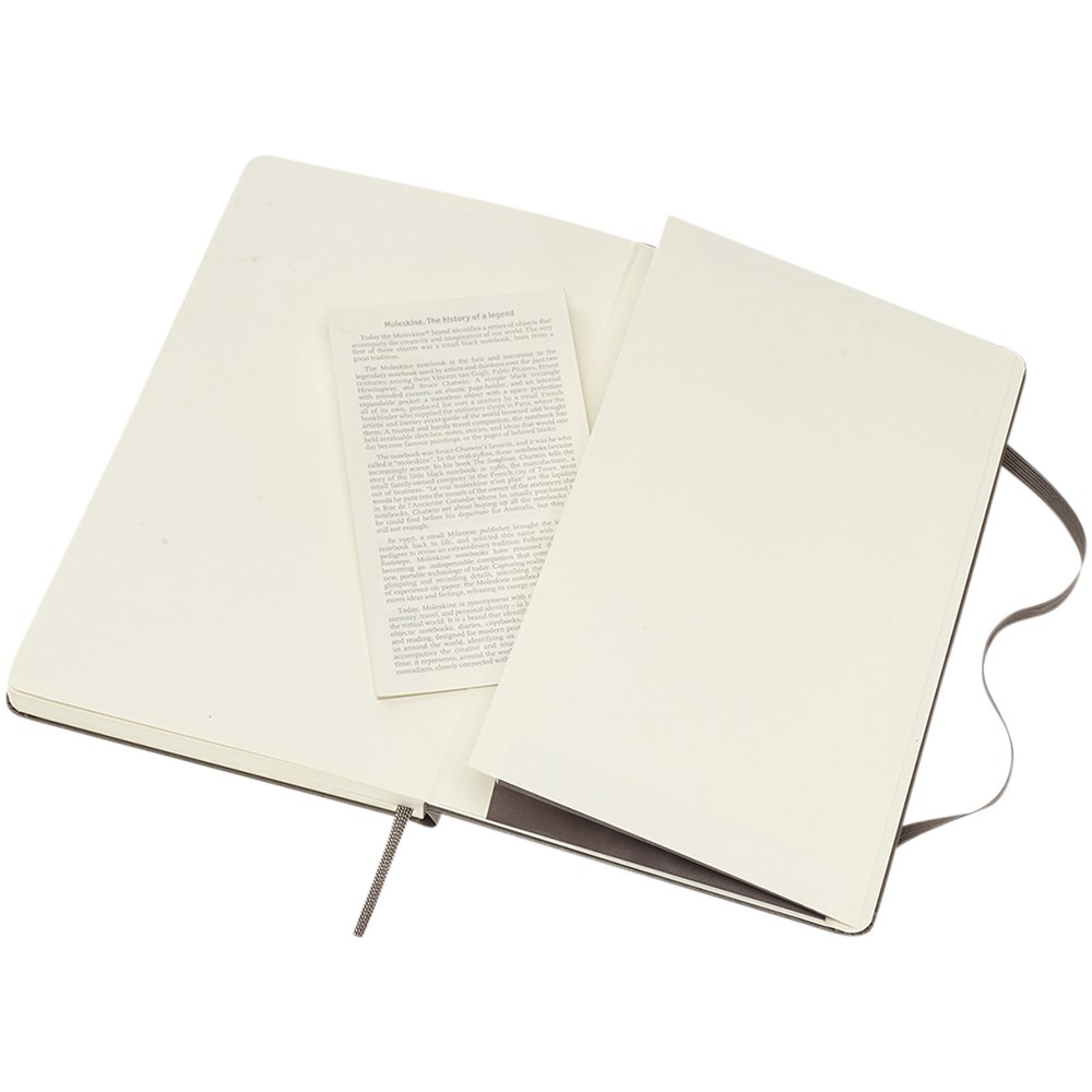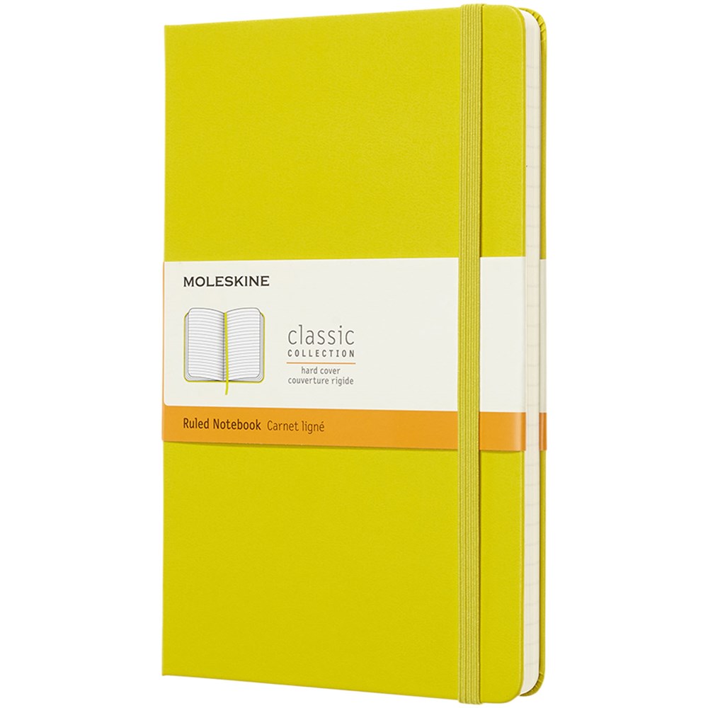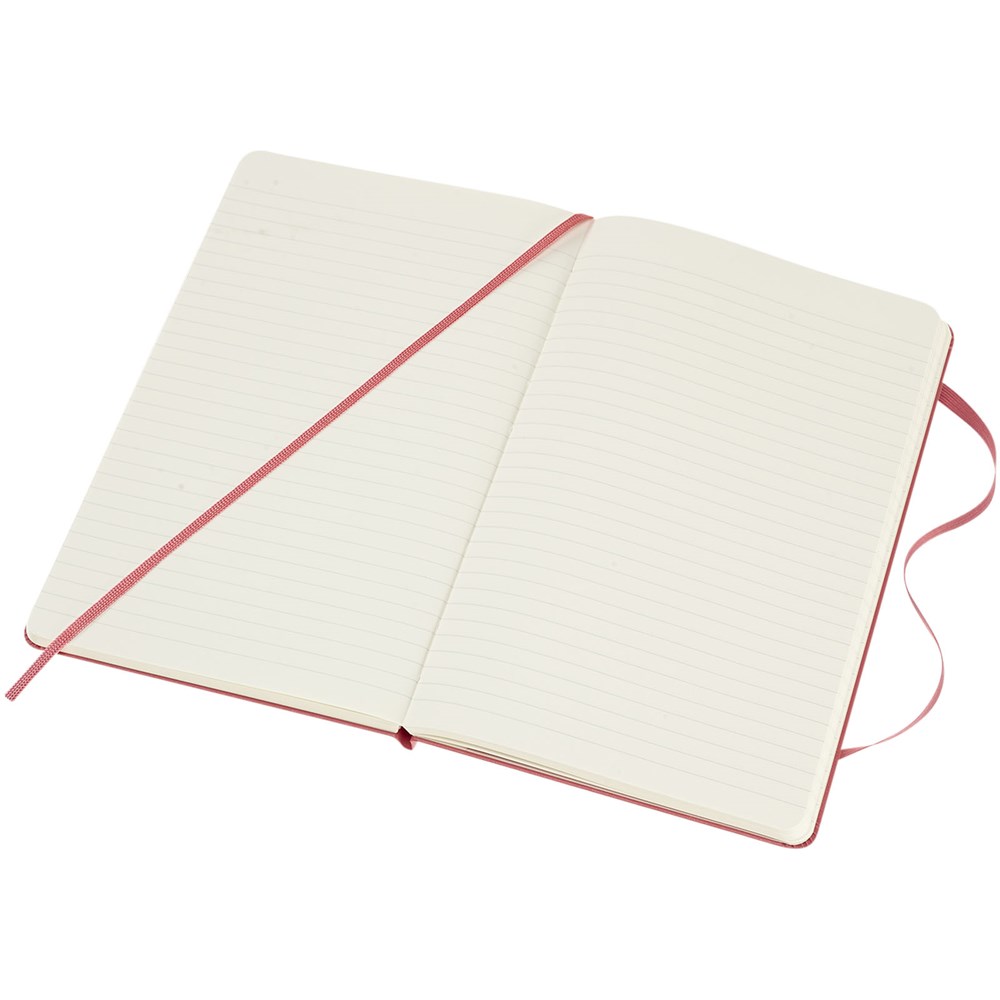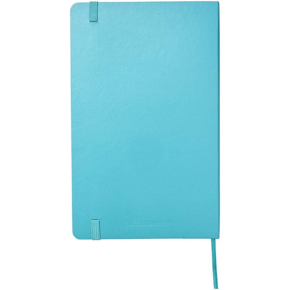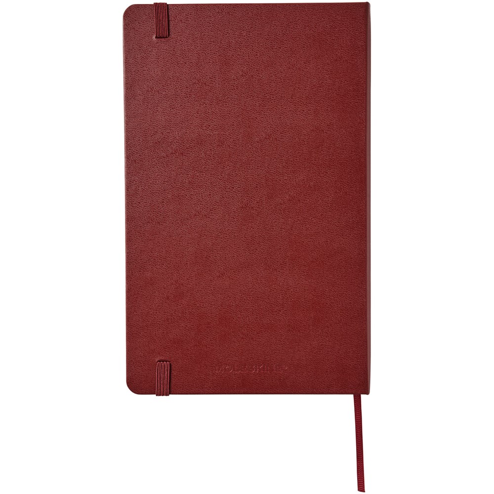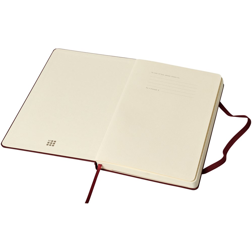 De Moleskine Classic large (13 x 21 cm) is voorzien van een harde omslag van gebonden karton met afgeronde hoeken, zuurvrij papier, een bladwijzer en een elastische sluiting. De eerste pagina biedt ruimte voor persoonsgegevens en het noteren van een beloning die de eerlijke vinder in geval van verlies ontvangt. Aan de achteromslag bevindt zich aan uitbreidbaar binnenvak met daarin de geschiedenis van Moleskine. Dit vak kan worden gebruikt voor losse papieren en notities. Bevat 240 ivoorkleurige gelinieerde pagina's. Pagina's zijn ook verkrijgbaar met stippen, ruitjes en in effen. Verkrijgbaar in diverse stijlvolle, levendige kleuren.