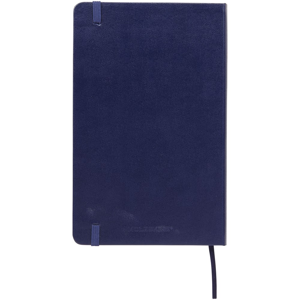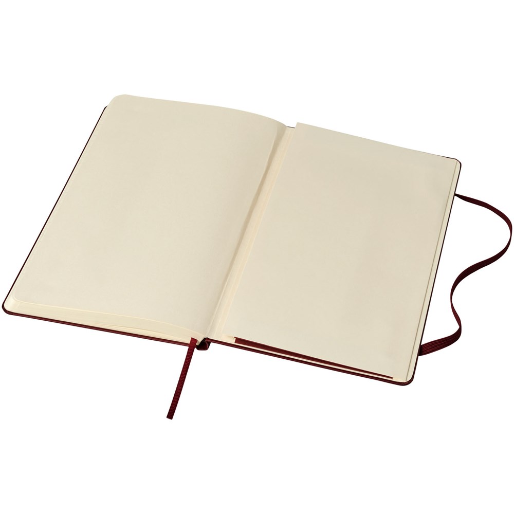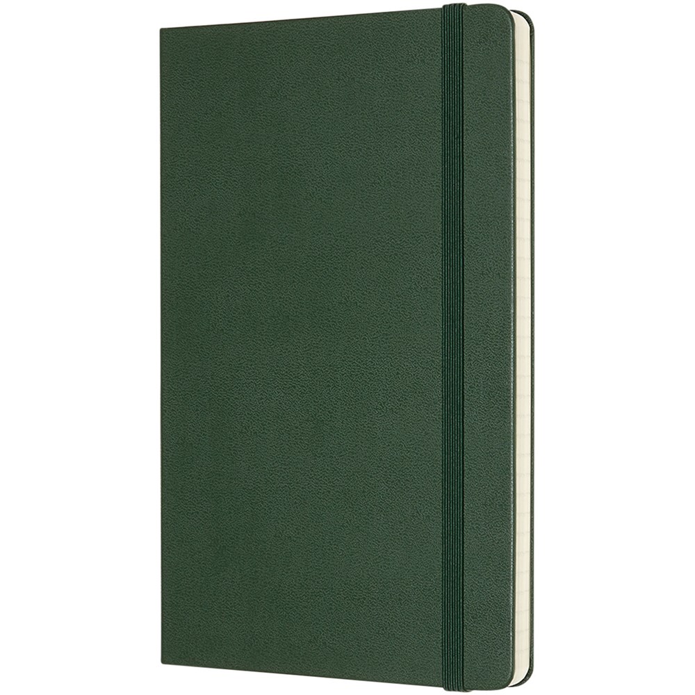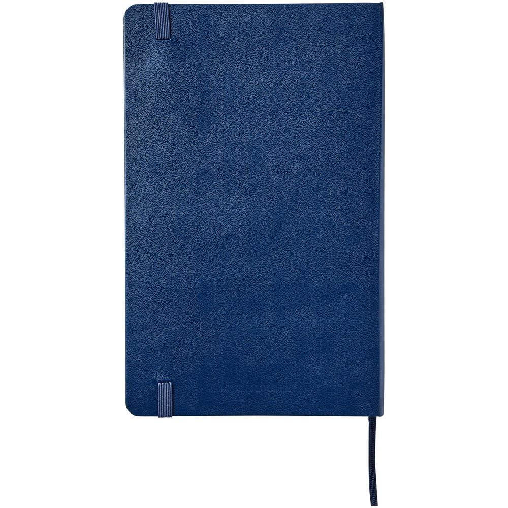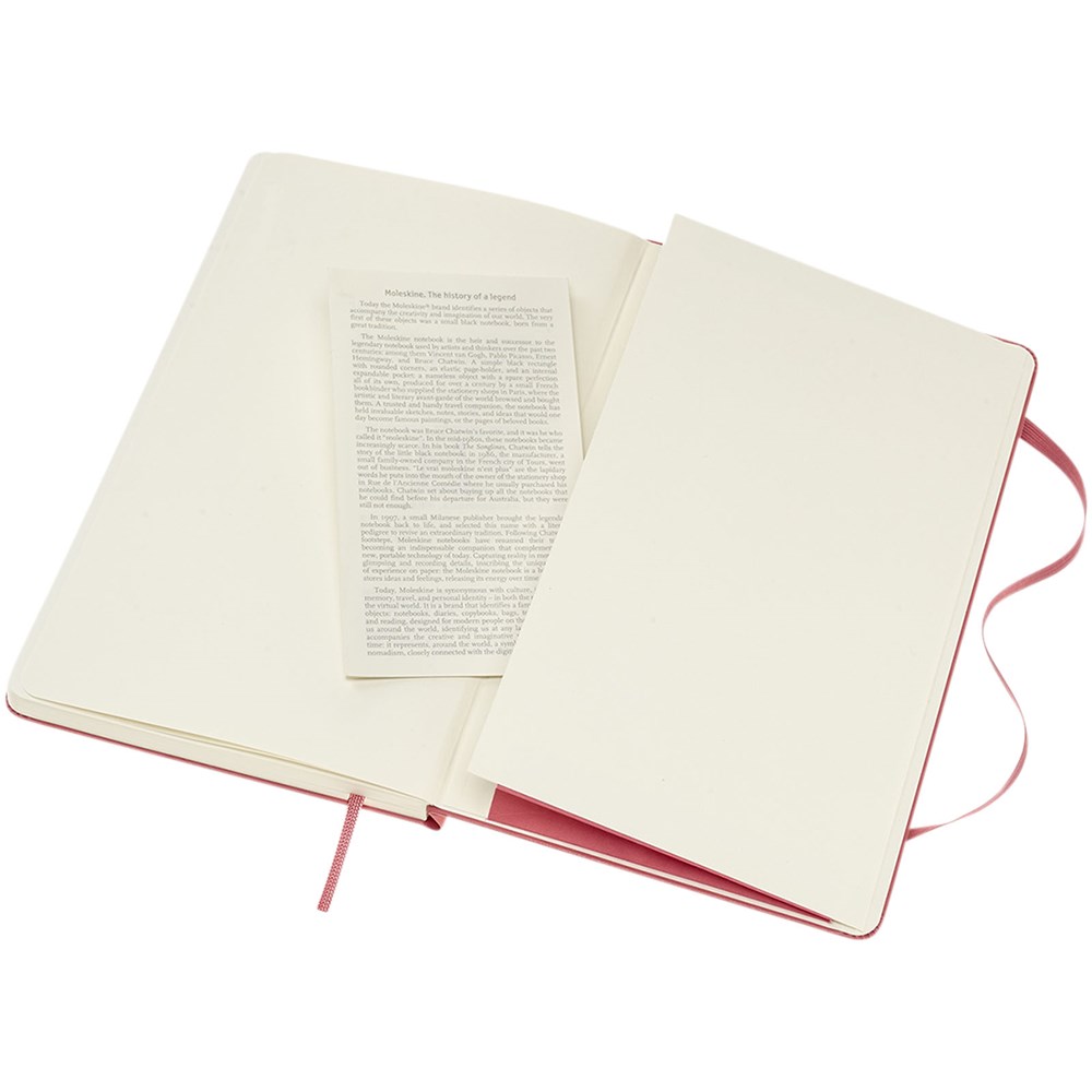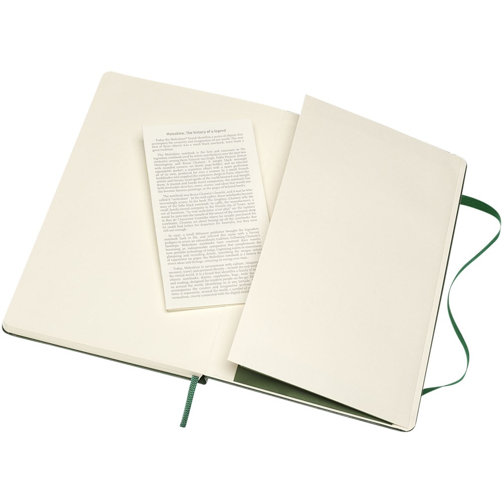 De Moleskine Classic large (13 x 21 cm) is voorzien van een harde omslag van gebonden karton met afgeronde hoeken, zuurvrij papier, een bladwijzer en een elastische sluiting. De eerste pagina biedt ruimte voor persoonsgegevens en het noteren van een beloning die de eerlijke vinder in geval van verlies ontvangt. Aan de achteromslag bevindt zich aan uitbreidbaar binnenvak met daarin de geschiedenis van Moleskine. Dit vak kan worden gebruikt voor losse papieren en notities. Bevat 240 ivoorkleurige gelinieerde pagina's. Pagina's zijn ook verkrijgbaar met stippen, ruitjes en in effen. Verkrijgbaar in diverse stijlvolle, levendige kleuren.