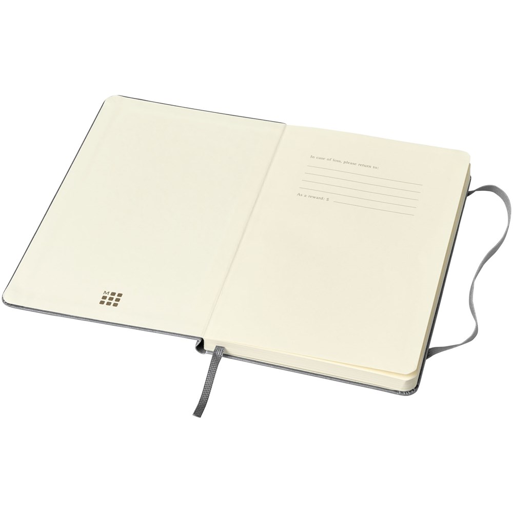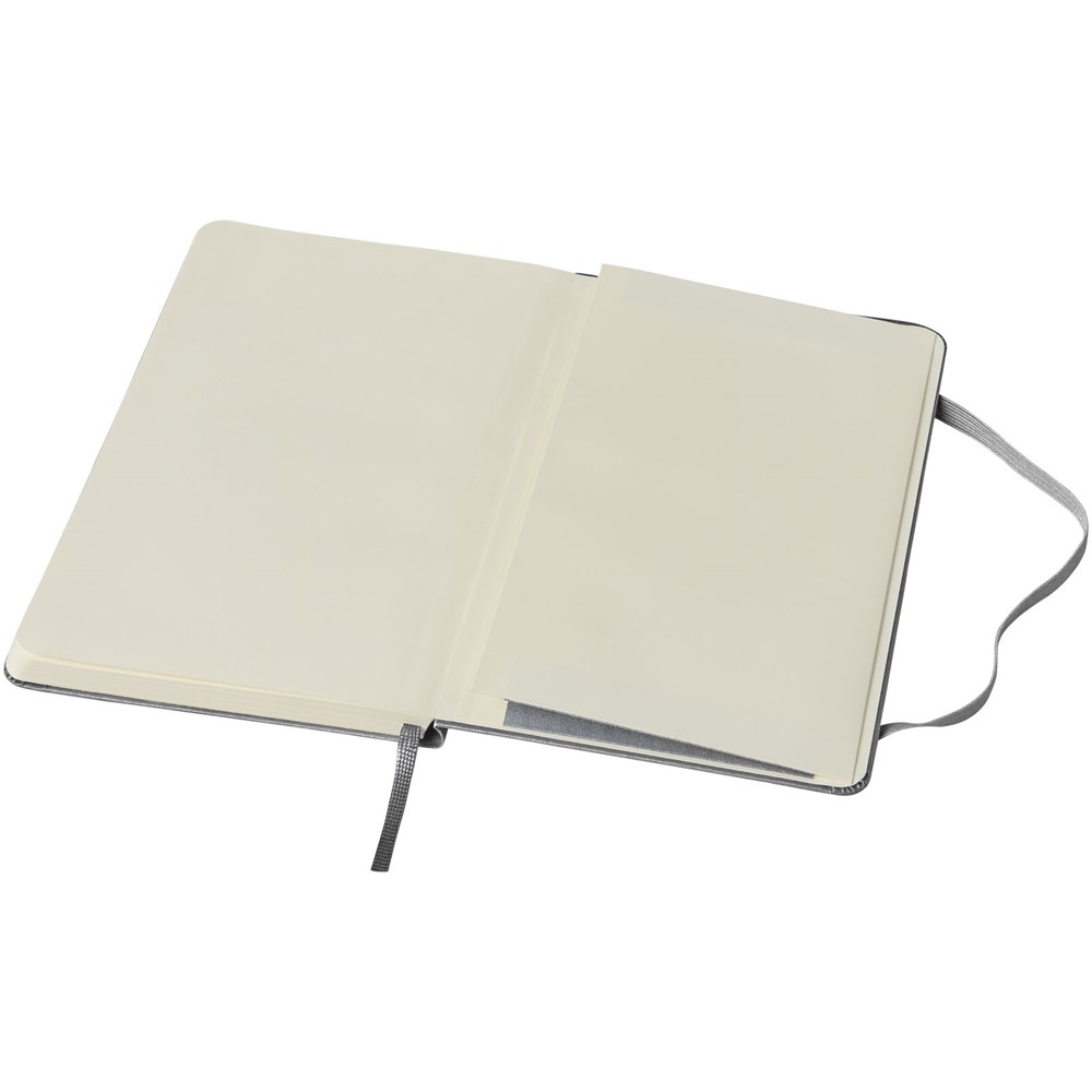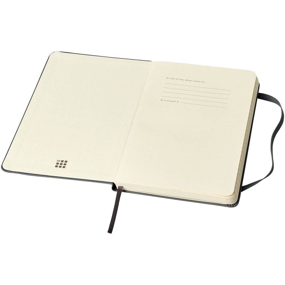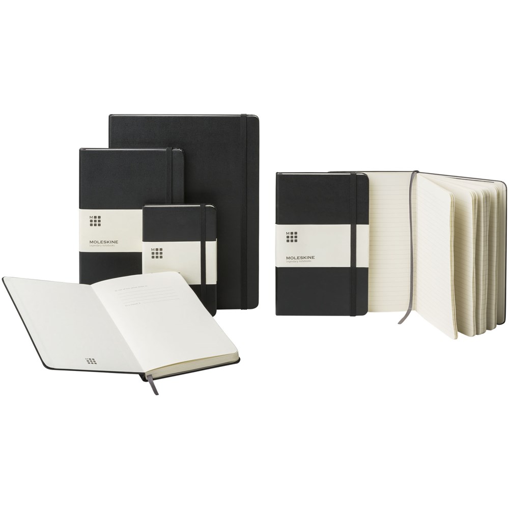 Classic M hard cover notitieboek - gelinieerd. Het Moleskine Classic hard cover notitieboek is nu verkrijgbaar in een medium formaat. Voorzien van de iconische afgeronde hoeken, een elastische sluiting en een bladwijzer. Uitbreidbaar vakje aan de binnenkant van de achterste omslag. Bevat 208 ivoorkleurige gelinieerde pagina's. Papier van kunstleder.
