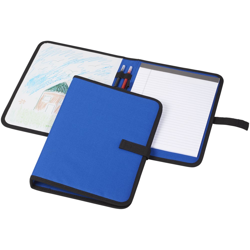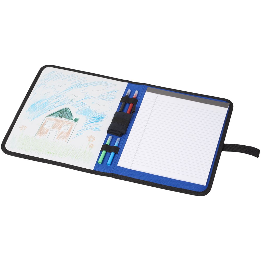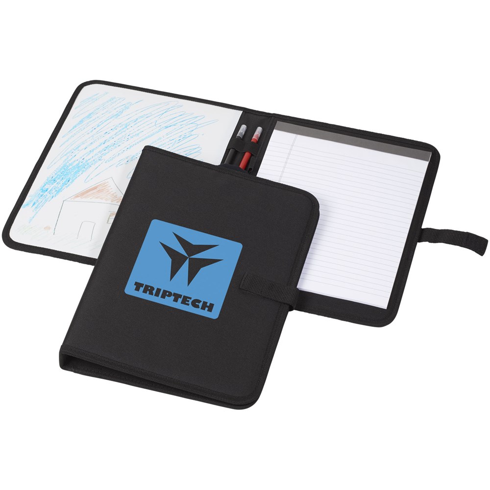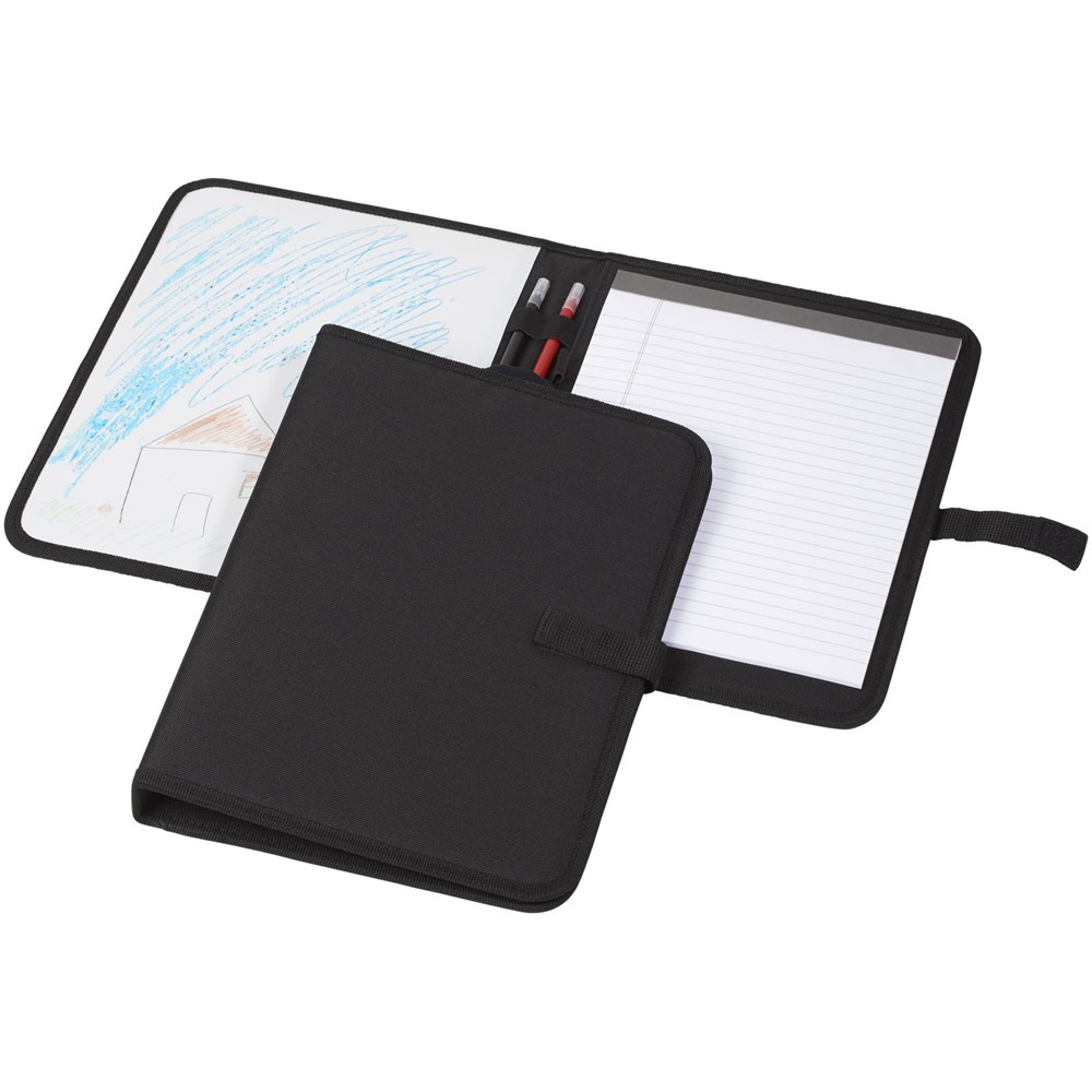 A4 portfolio met lus-haaksluiting. Inhoud bestaat uit een whiteboard en een notitieblok met 30 vel gelinieerd papier. Inclusief stiften en en schoonmaakdoek.
