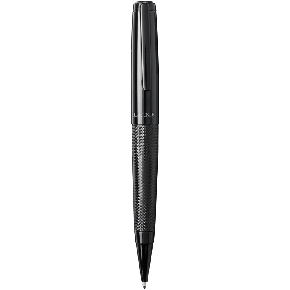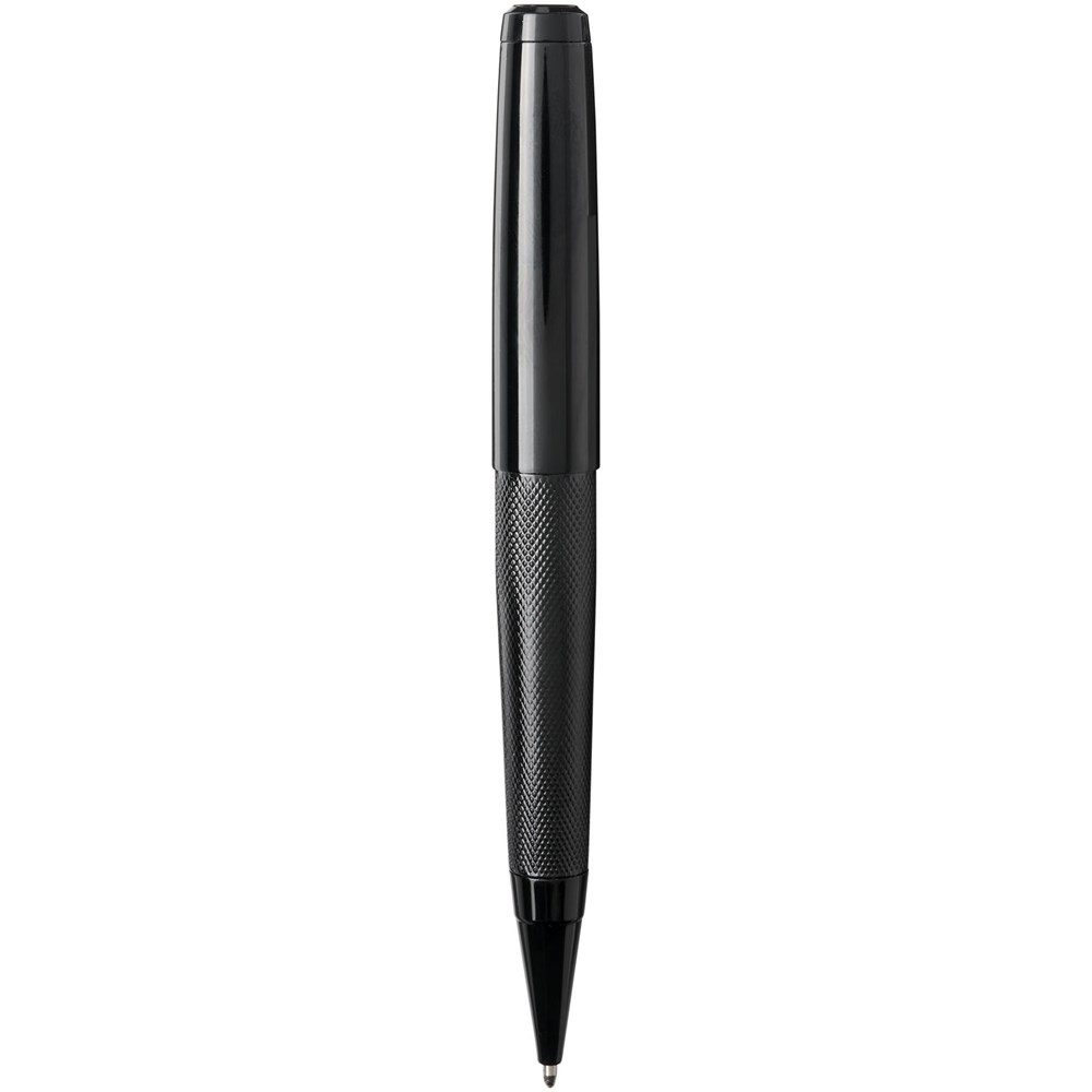 Balpen en rollerbalpen geschenkset met zwarte boven- en onderkant van de huls met een glanzende afwerking, geleverd in een luxe geschenkverpakking. Balpen: 14 cm x 1,45 cm, gewicht: 40 gr, schrijflengte: 800 m. Rollerbalpen: 13,8 cm x 1,45 cm, gewicht: 54 gr, schrijflengte: 400 m.