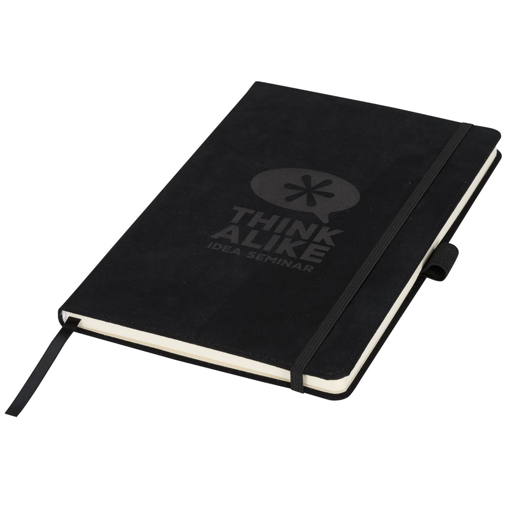 A5 formaat suède notitieboek met harde kaft, elastische sluiting in bijpassende kleur, lintmarker en penlus. 80 g/m2, 80 vellen crèmekleurig lijntjespapier. Heeft tevens een uitbreidbaar vakje aan de achterkant voor kleine notitieblaadjes. Verpakt in een zwarte geschenkverpakking.