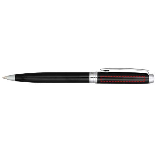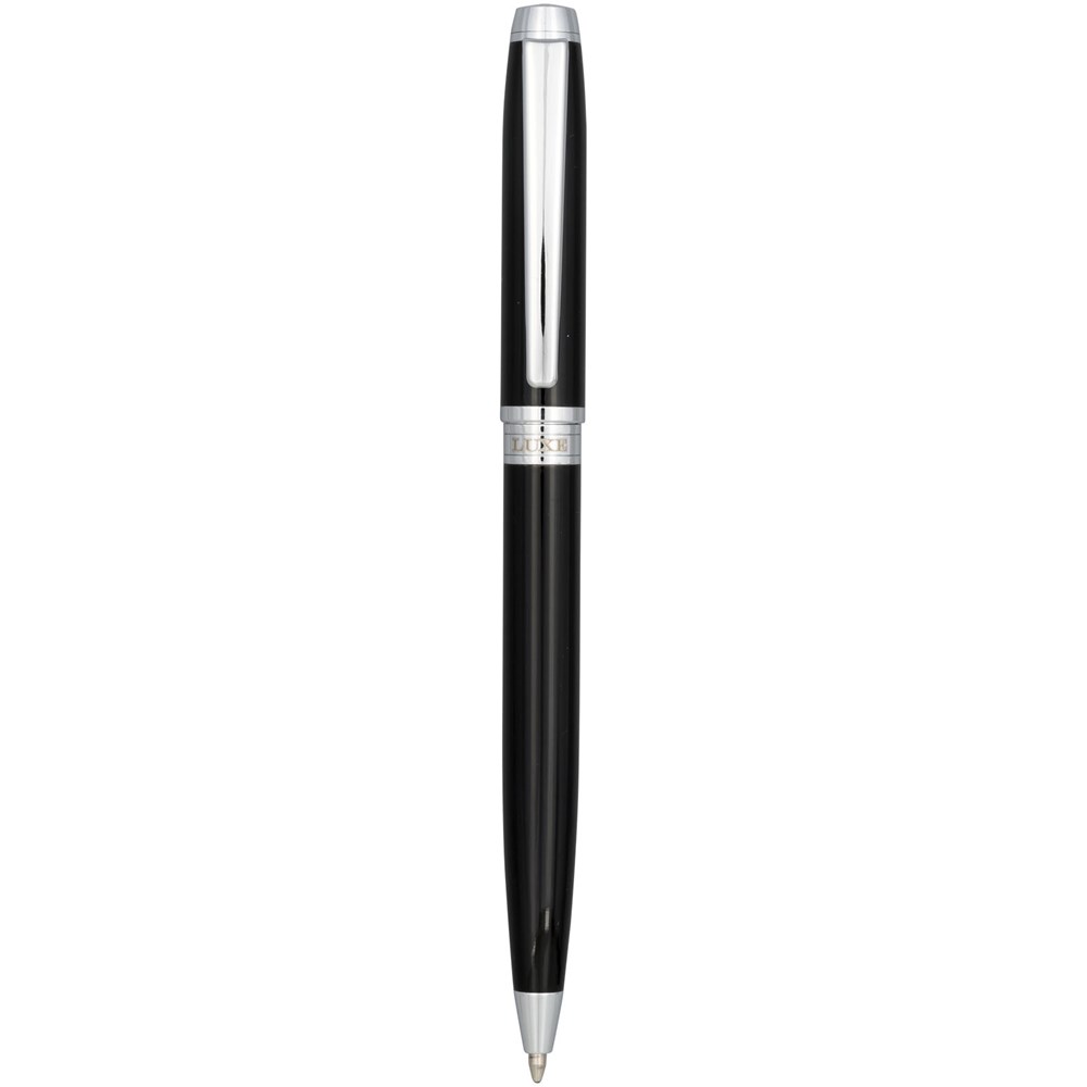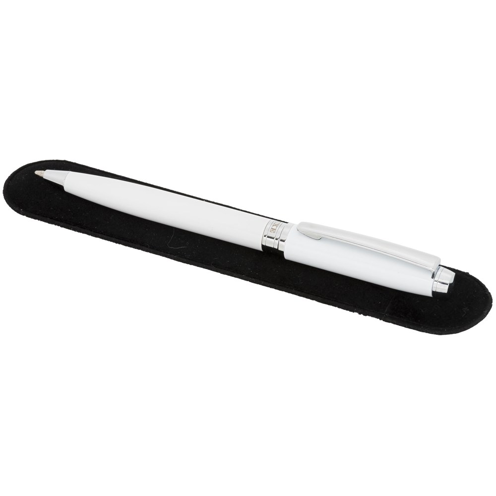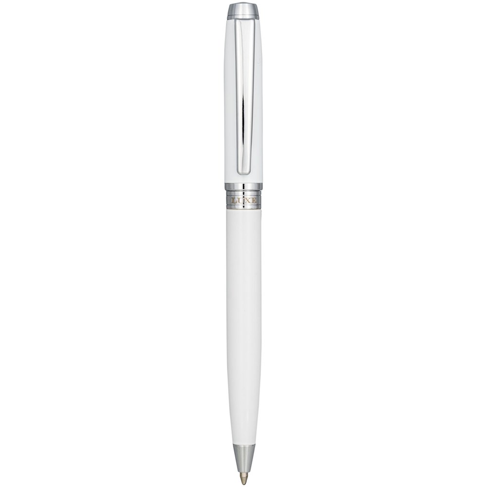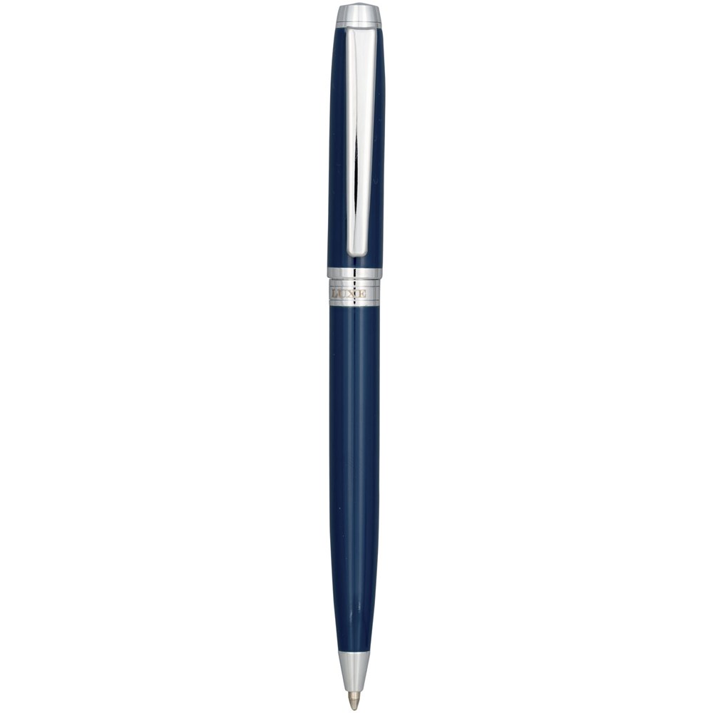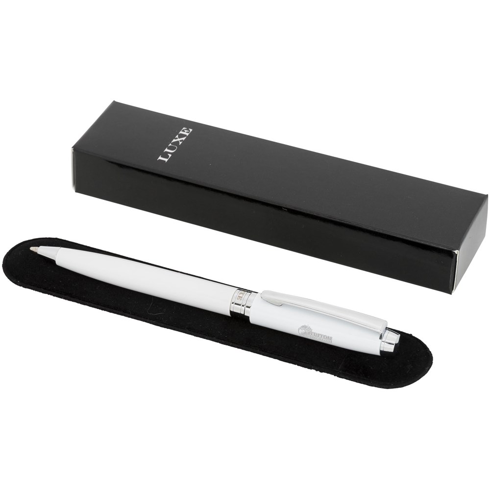 Balpen met exclusief design en gekleurde boven en onderhuls. Met een hoogwaardige zwarte navulling en een fluwelen zakje. Verpakt in een ''LUXE'' geschenkverpakking (grootte: 17 x 3,5 x 2 cm).