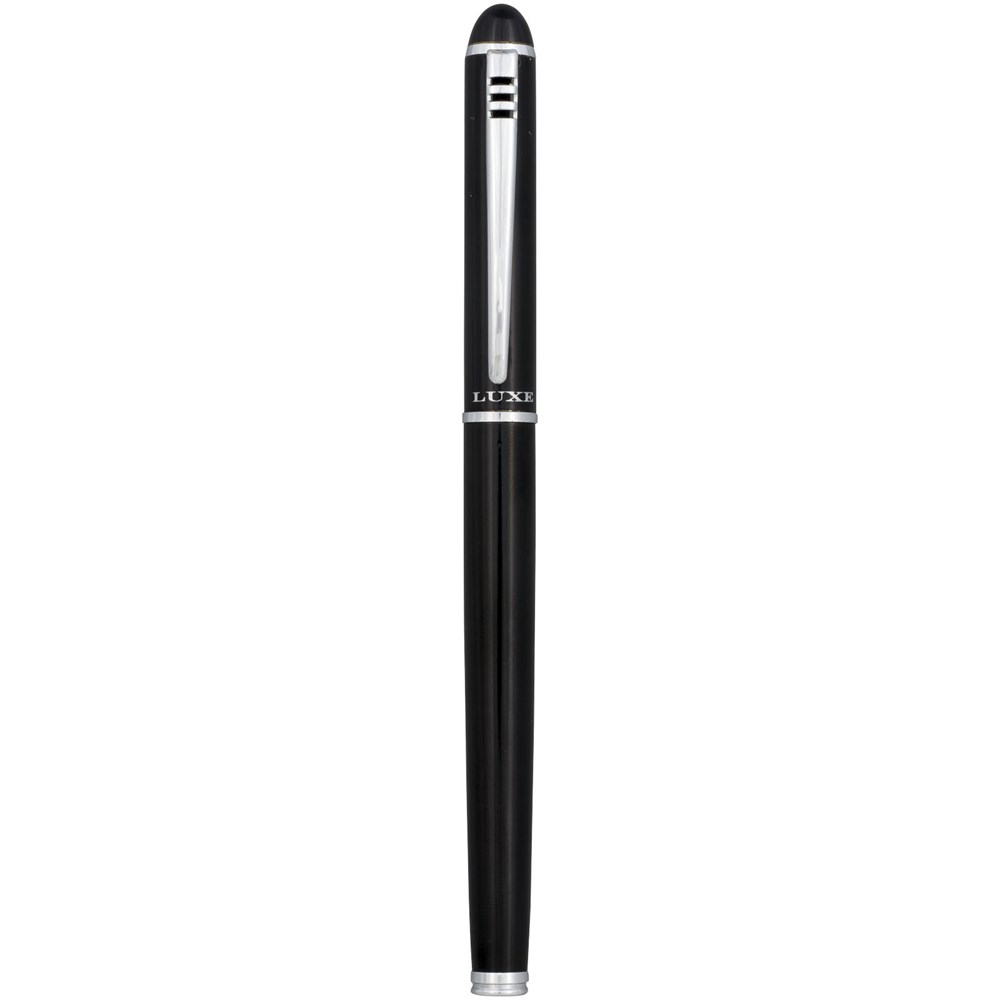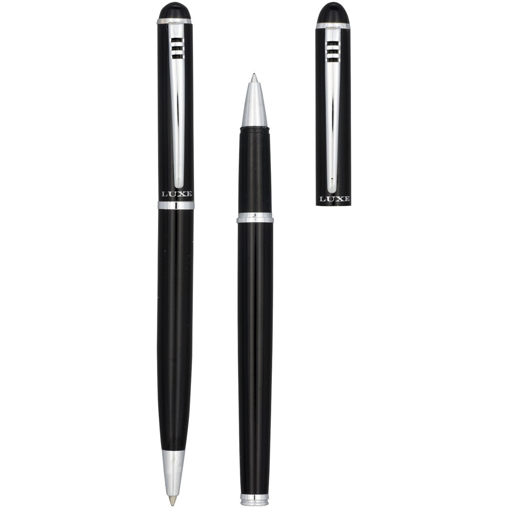 Exclusief ontworpen draaibalpen en captype pennenset met roller. Verkrijgbaar in glanzend zwart, matzilver en matblauw. Verpakt in een luxe geschenkverpakking.