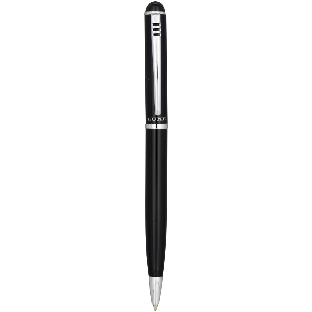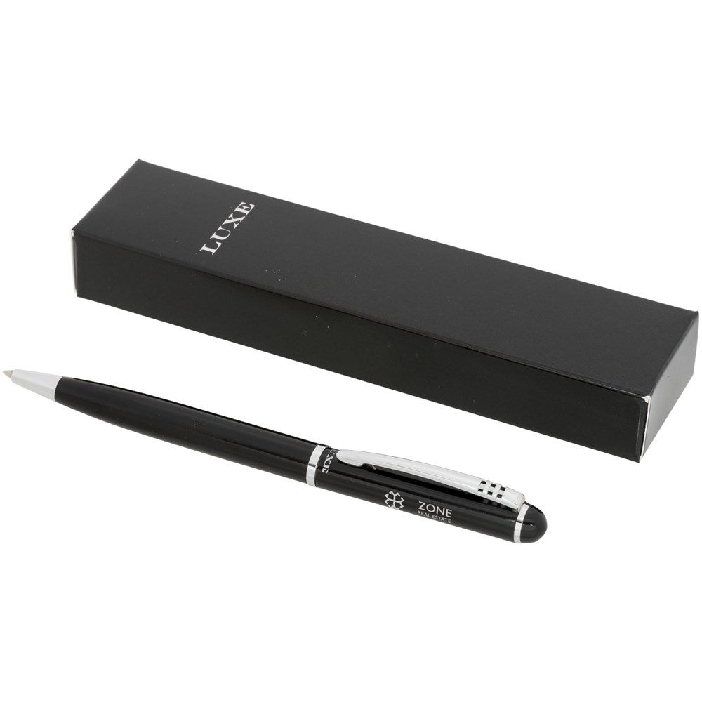 Exclusief ontworpen balpen met draaimechanisme. Verkrijgbaar in Glanzend Zwart, Mat Zilver en Mat Blauw. Geleverd in ''LUXE'' geschenkverpakking (16 x 5 x 2,5 cm).