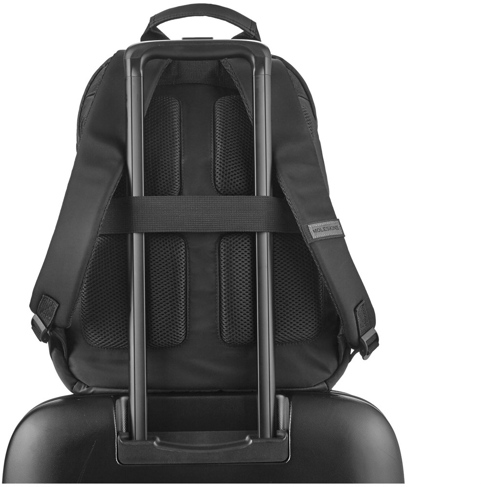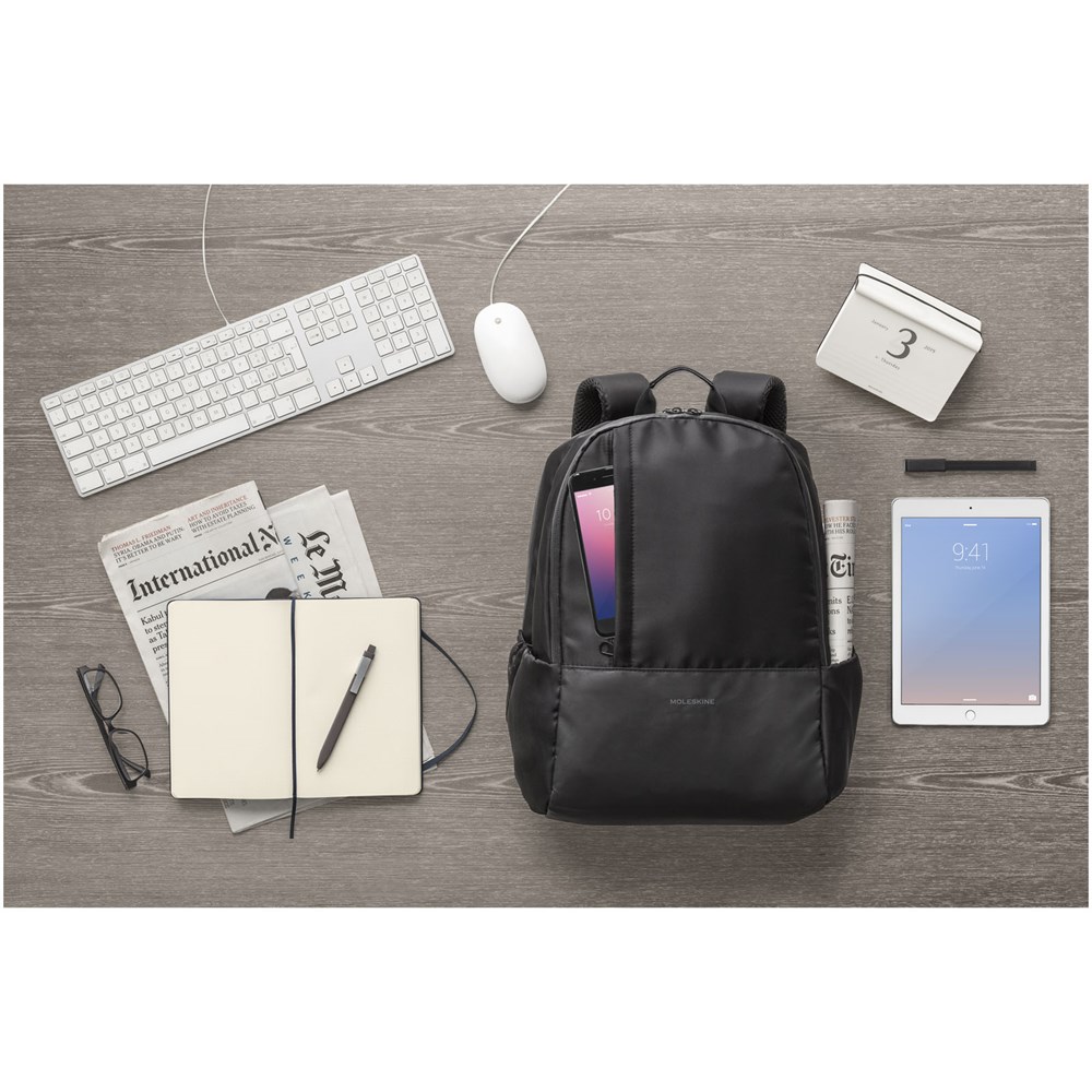 Zakelijke rugzak met trolleyband, blinde beveiligingsrits, eenvoudig toegankelijke buitenvakken met rits voor je telefoon en twee zijvakken. Belangrijke functies aan de binnenkant zijn een gewatteerd laptopvak (tot 15 inch), gewatteerd tabletvak (tot 10 inch), vakken voor kaarten, tickets en bonnetjes.
