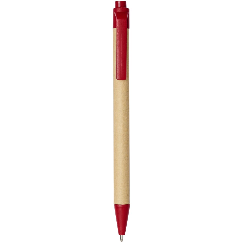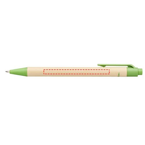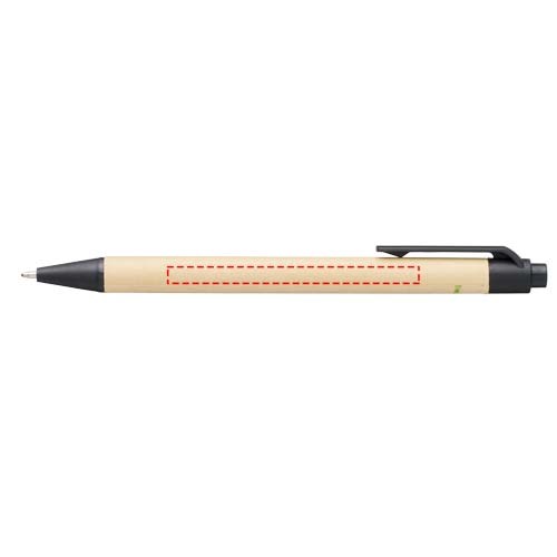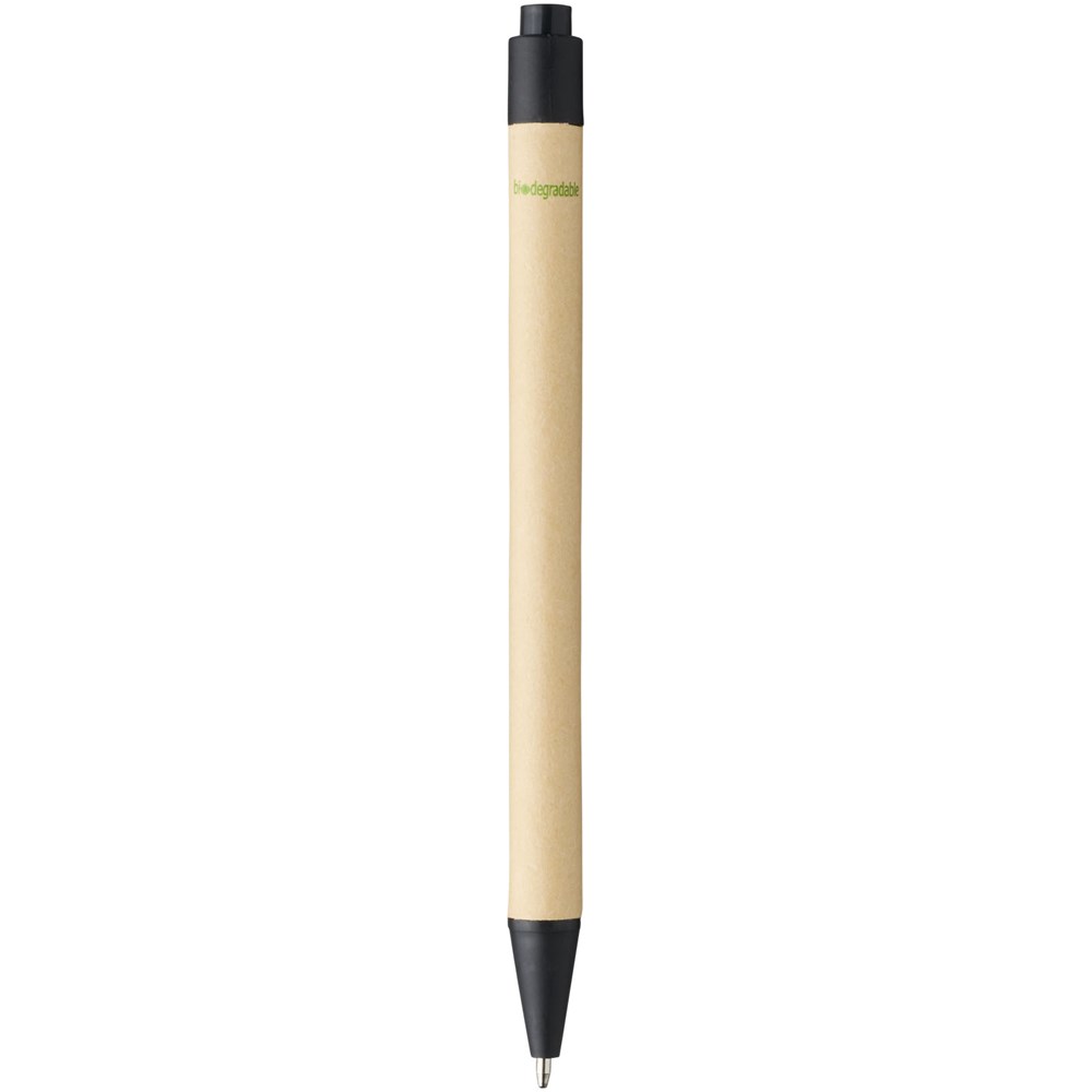 Ecovriendelijke balpen met klikmechanisme, met een huls van biologisch afbreekbaar papiermateriaal en mais plastic sierstrips in verschillende kleuren. De kleur van het gerecyclede karton kan variëren.