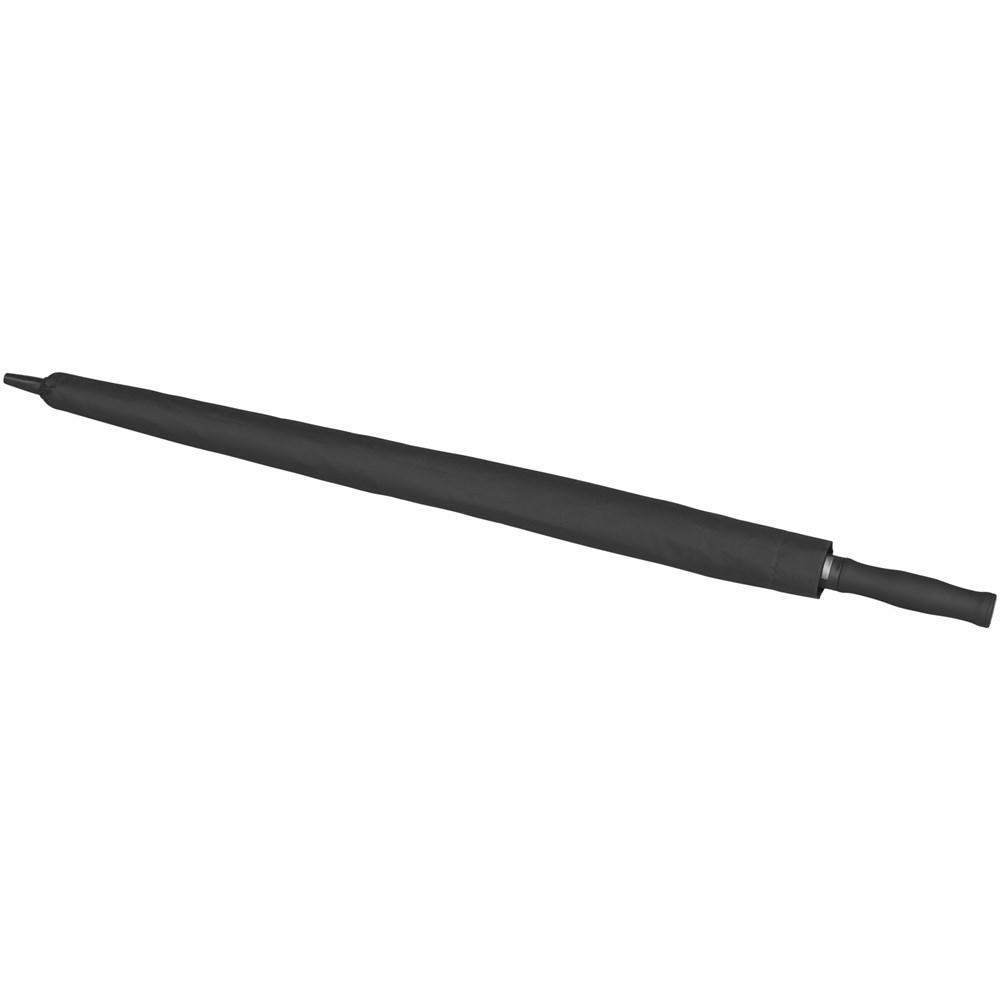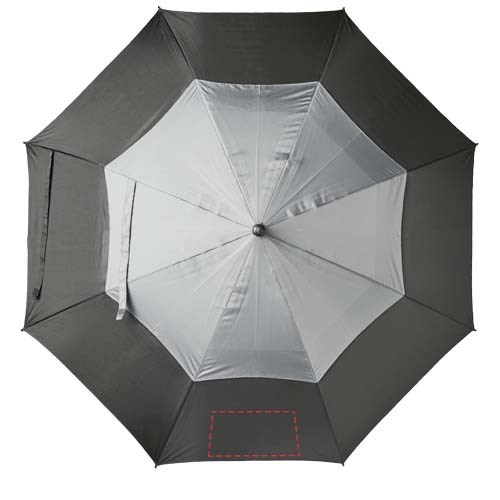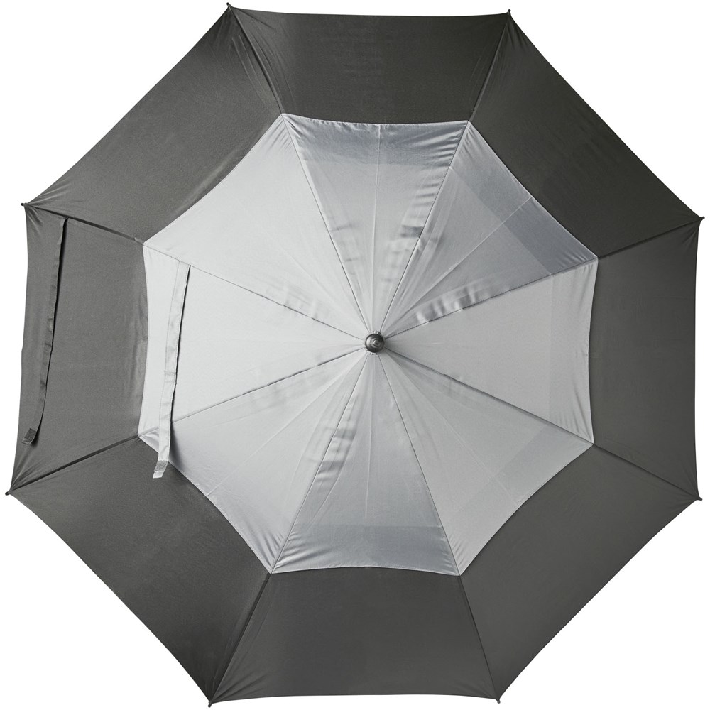 Automatisch openende golfparaplu met geventileerd scherm van pongé polyester, groot genoeg om 2 personen droog te houden. Metalen schacht met glasvezel baleinen en speciaal ventilatiesysteem voor maximale flexibiliteit bij harde wind. Geventileerde opberghoes van pongé polyester in contrastkleur. 'Luxe' branding in doming-techniek op de handgreep met rubberlaag en drukknop in grijs metallic afwerking. Twee stevige sluitriempjes in bijpassende kleuren. Met hoes. Het perfecte cadeau met de perfect luxe uitstraling.